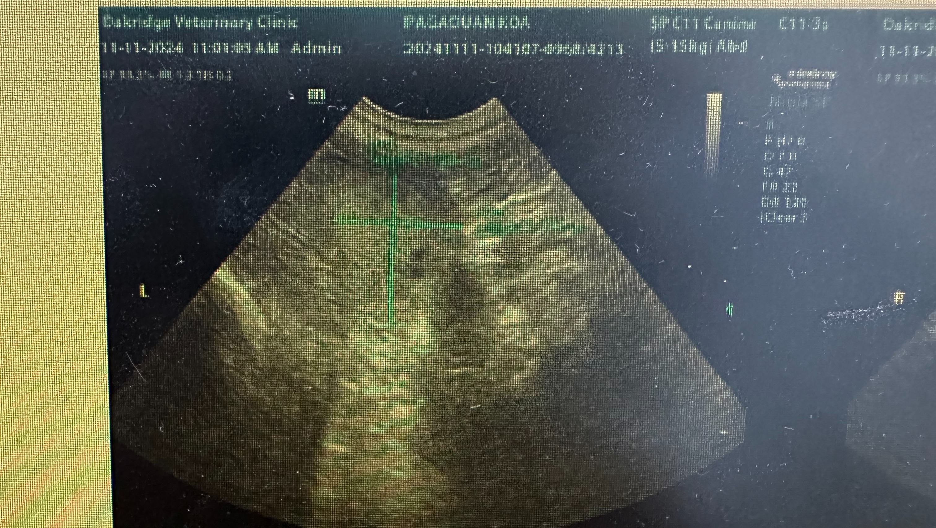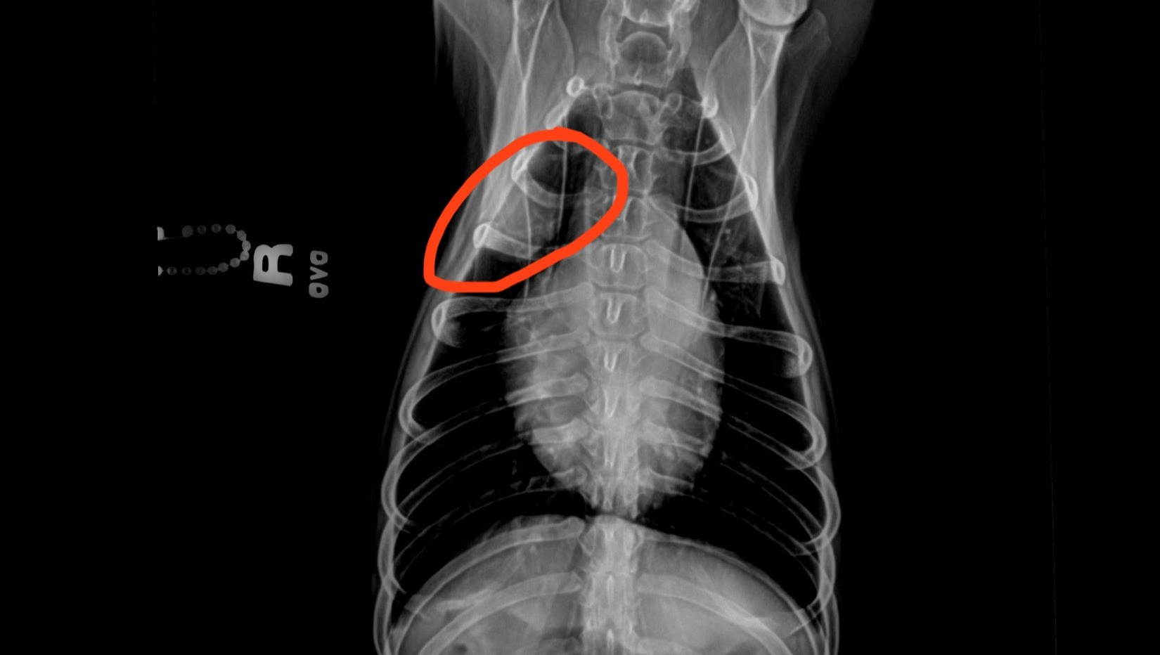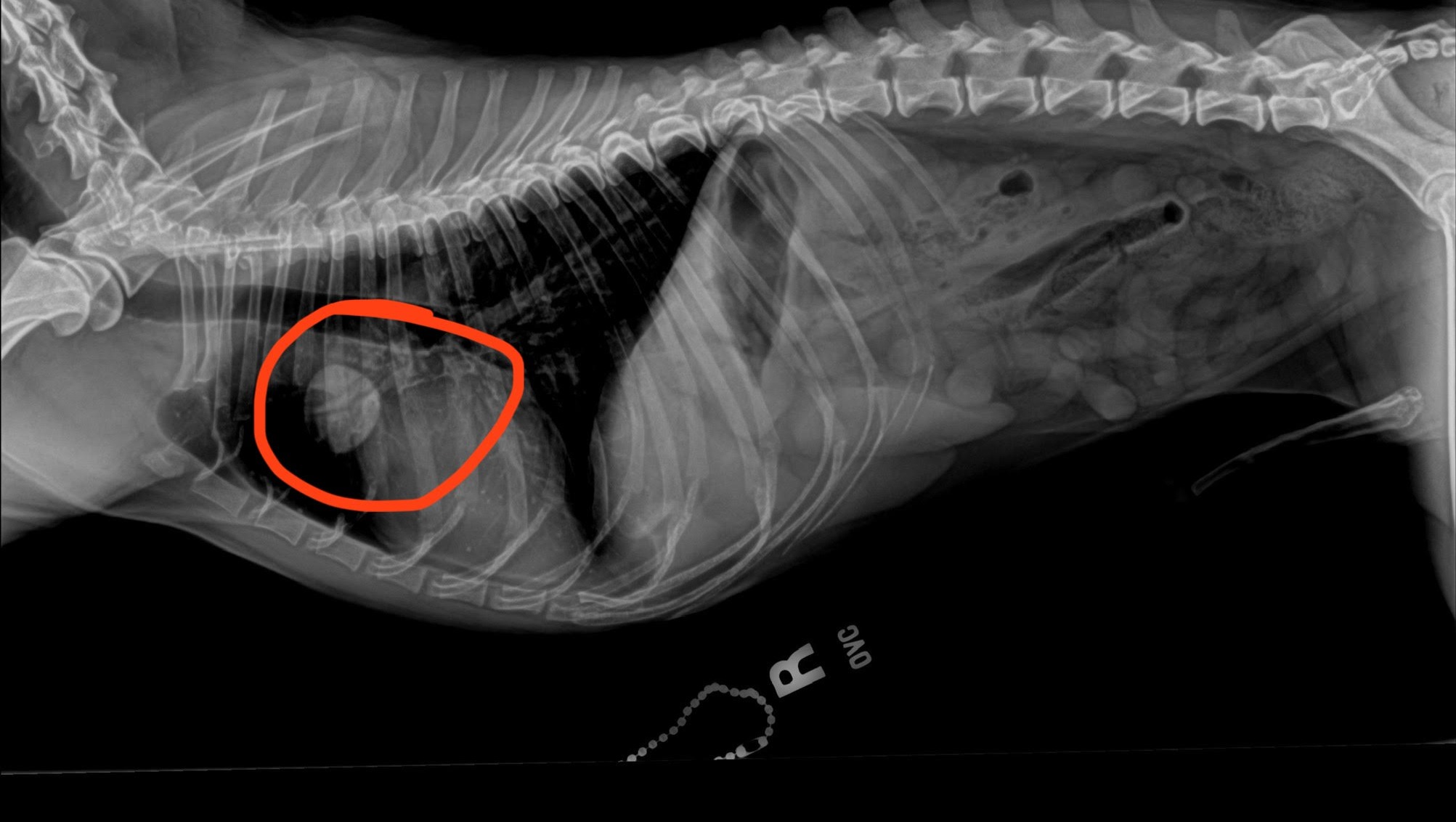 Attached, you will find images of the lung mass from the x-rays circled in red. You will also find the image from the abdominal ultrasound confirming the presence of the mass on his liver marked by green lines indicating approximate measurements.