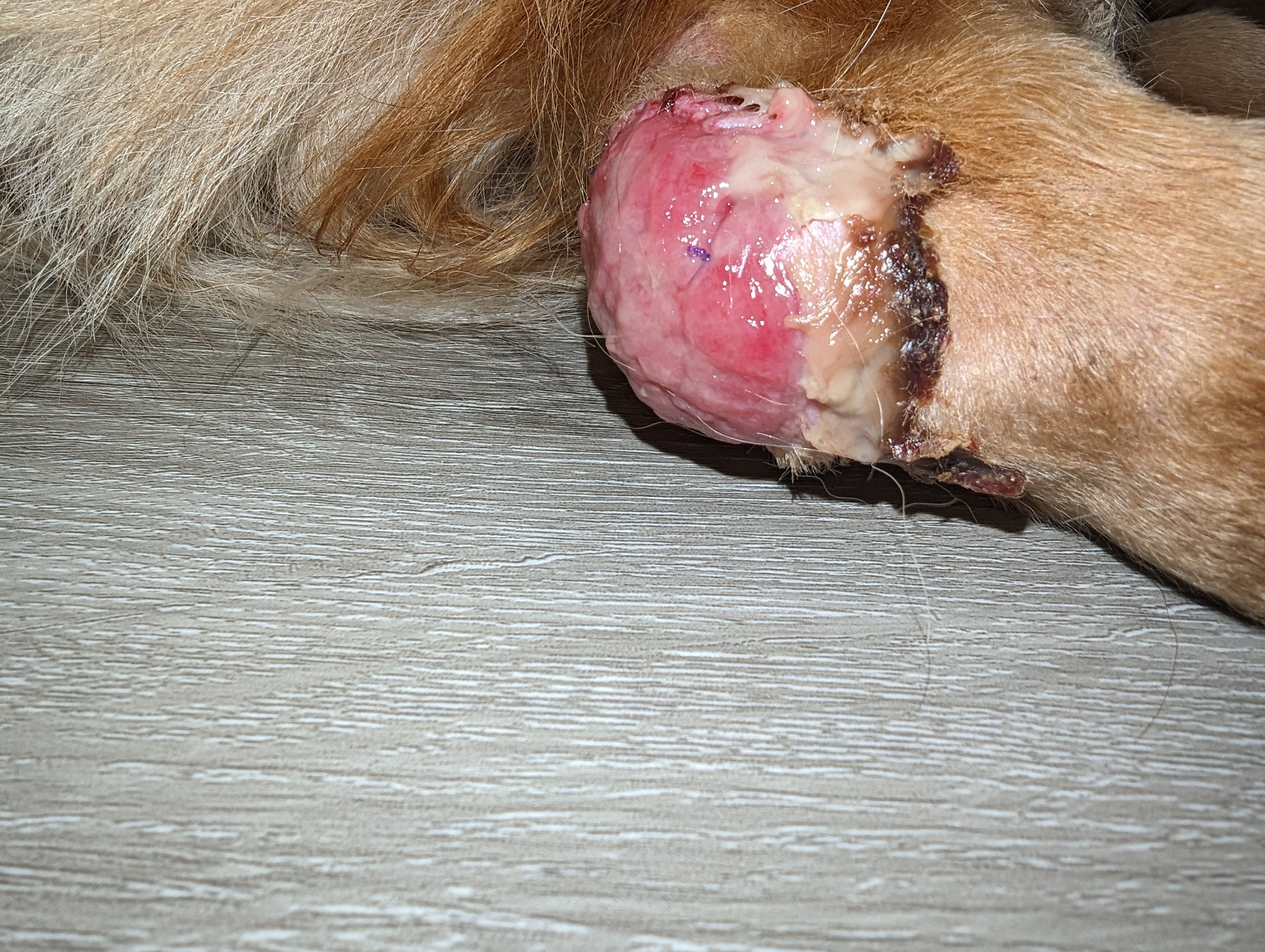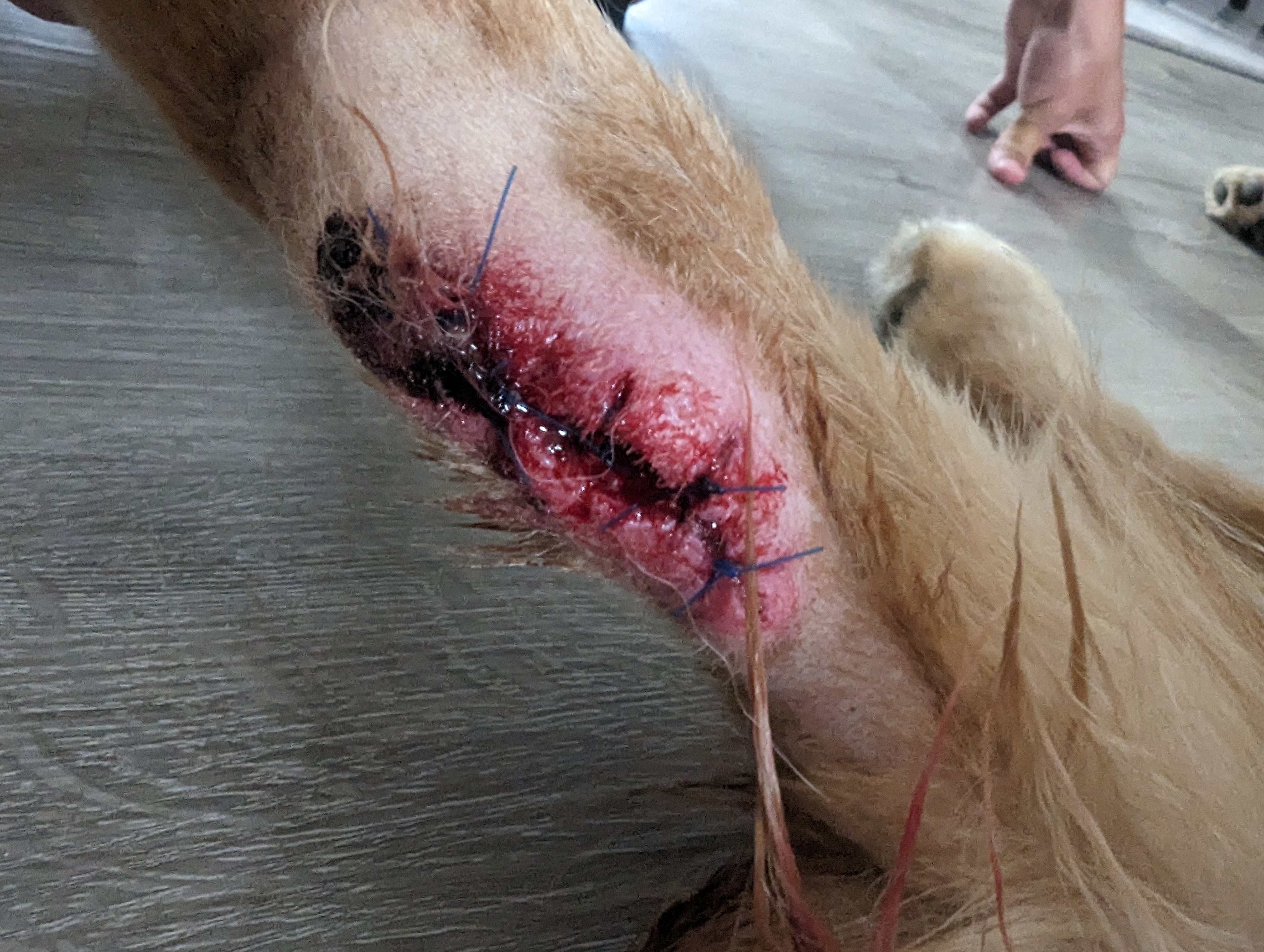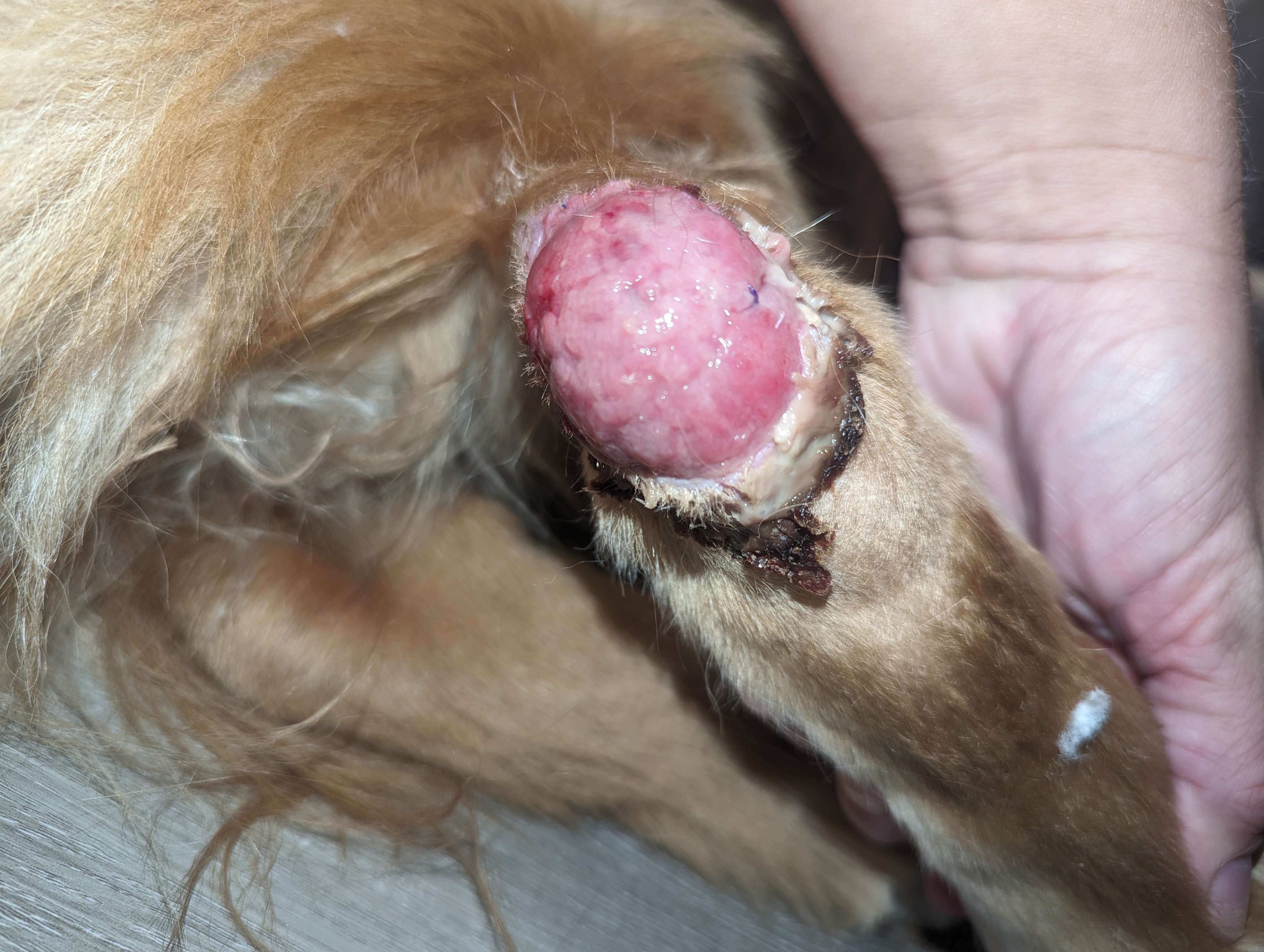 Meet Kobe—a gentle, golden-hearted pup who’s been through far more than any dog should have to endure. June 18th what started as a small wound quickly spiraled into something much more serious. Multiple trips to the vet, a growing infection, and now—after surgery, stitches, and bandages. His wound doesn't allow him to be the playful puppy he is so used to being. Strict orders from the vet not to go on walks or play ball or go to his favorite place, the dog park with all of his friends. —he’s on a long road to recovery.