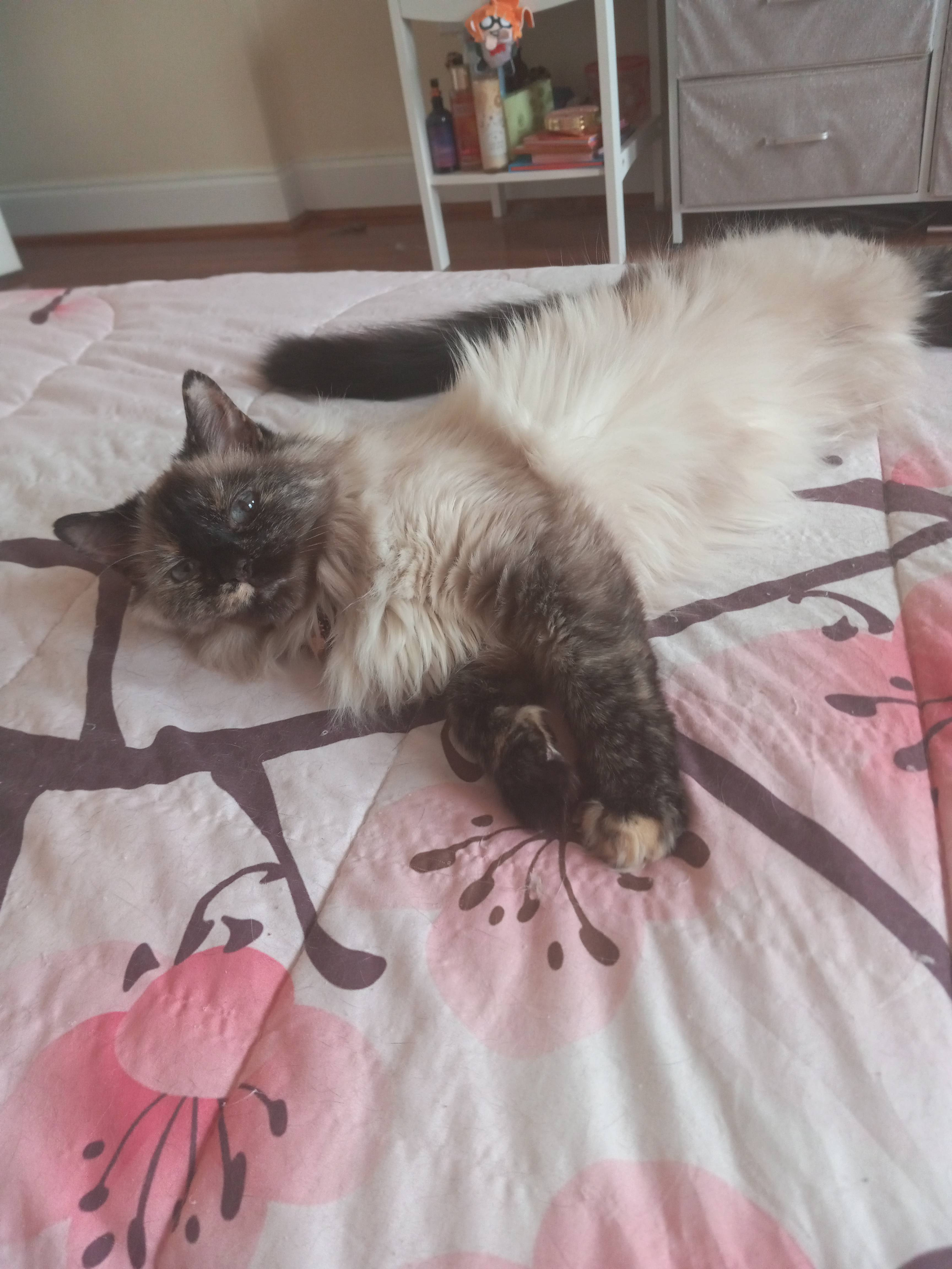 Everybody talks about soul cats, and how one cat bonds to them for the length of her life. Mimi is that cat for me; I love her with my entire soul. If it comes down to it, I have accepted that I must find a rescue to care for her should I not be able to raise the funds to help her myself. She's my entire world, and it breaks my heart to see her in pain while I can do nothing about it with circumstances outside of my control. This is why I've picked myself up out of this cloud of depression to beg of you all to share this around. If I can at least get enough money to have her tested, maybe we can get her medicine to curb whatever is ailing her. Like all pet owners, it devastates me that I might have to lose my little girl, but if it comes down to it, I want her to flourish and live her life rather than be in pain any longer.