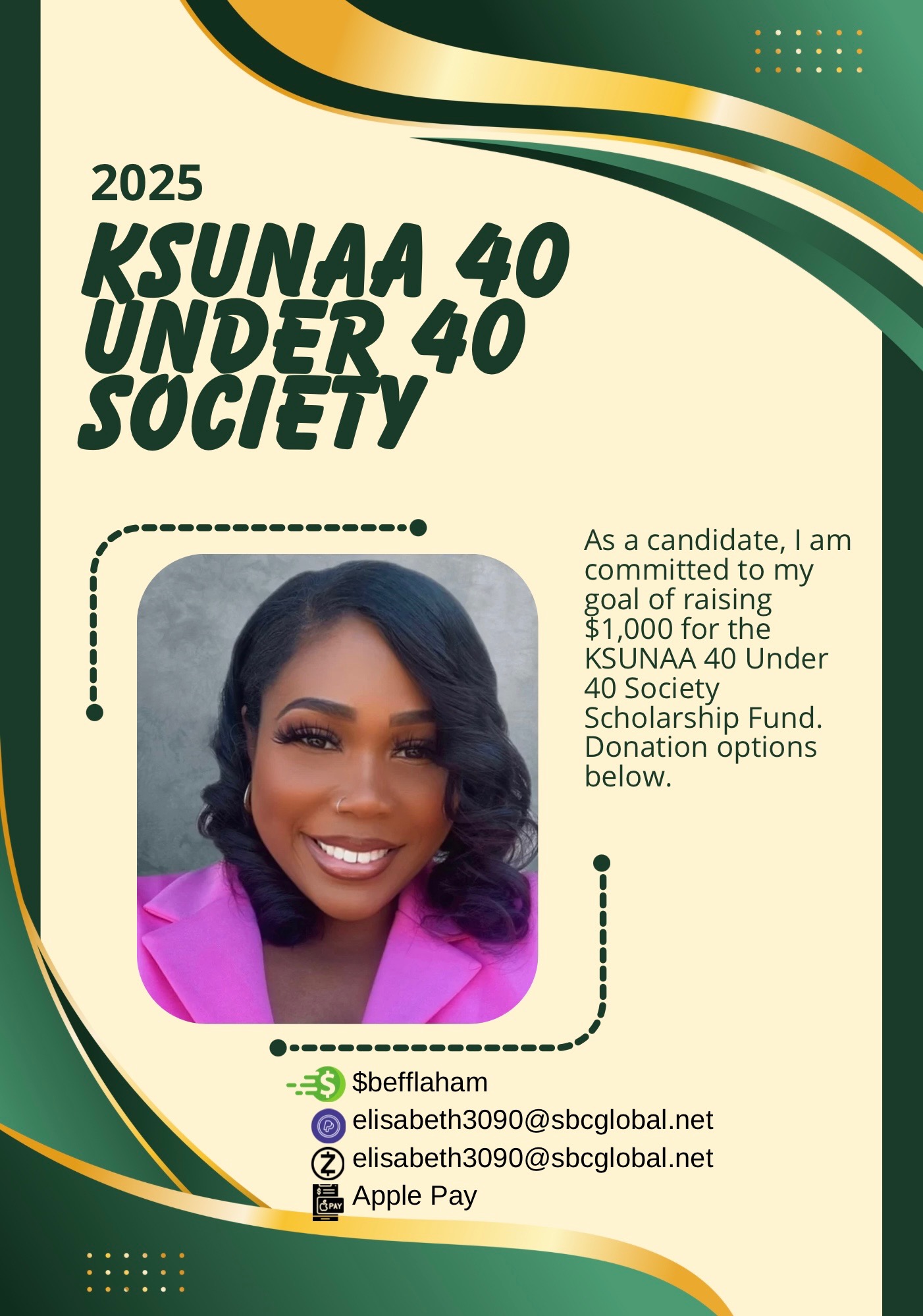 I am collecting donations to commit to my goal of raising money for the KSUNAA Scholarship Fund. If you would like to donate, donations can be made at my GoFundMe link. Thank you for your support!