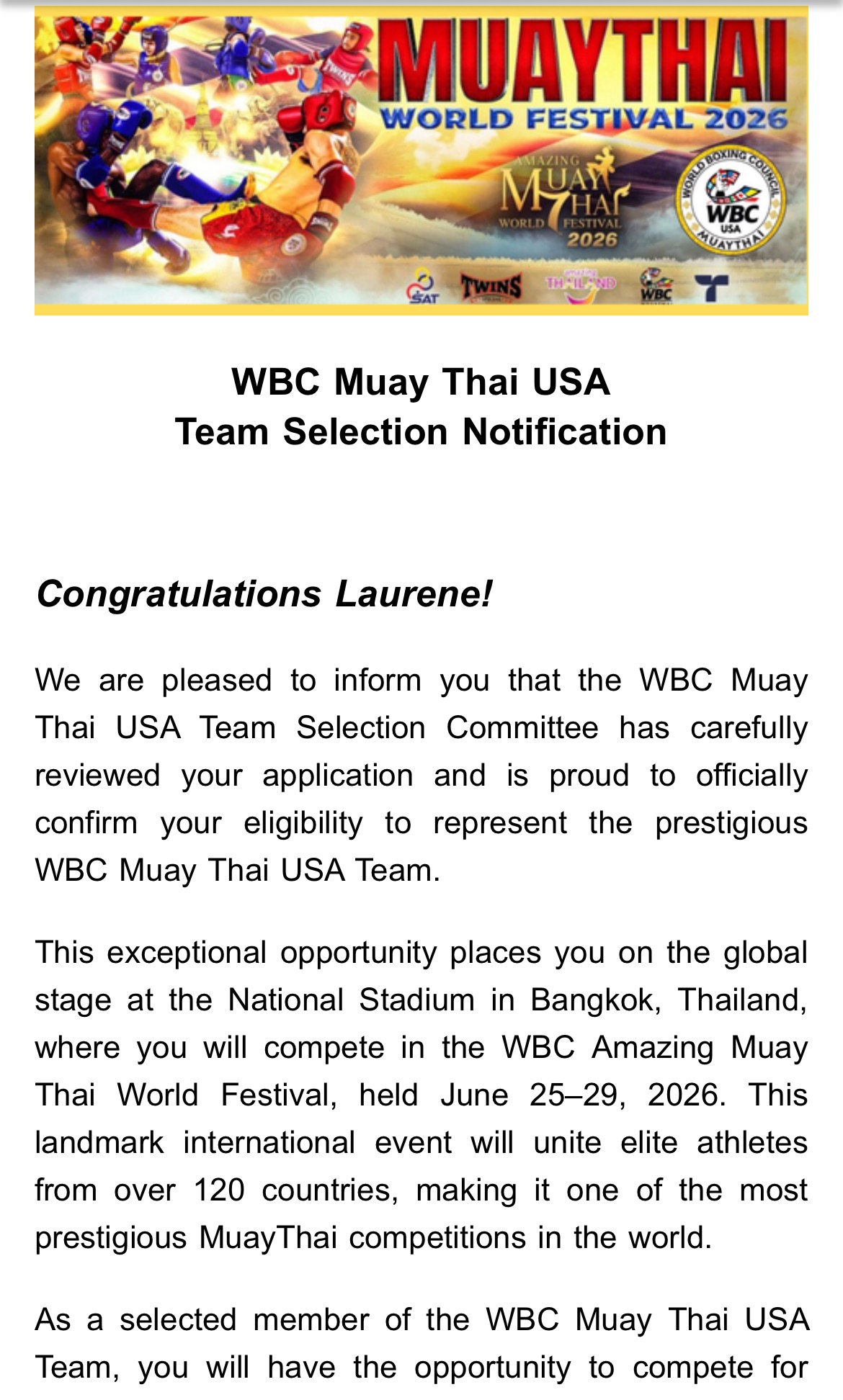 The "2026 Amazing Muay Thai World Festival" will feature tournament styles and elite pro fights bouts. Each country sends a team, and I am honored to have been selected as part of Team USA, my first time being part of a national team in all of my career (38pro fights).