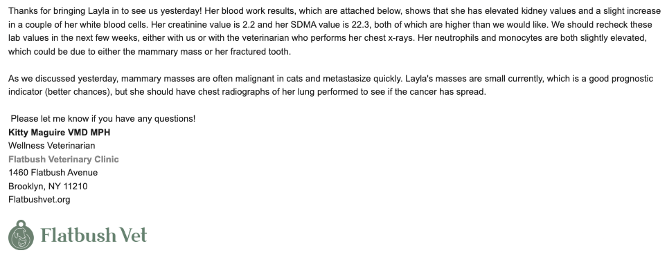 For a better understanding, please look at the picture with the email from the vet and the summary of her vet visit.