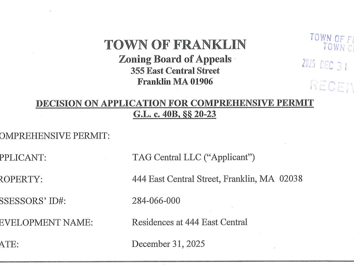 A group of Franklin, Massachusetts residents and abutters is raising funds to support a legal appeal of a recently approved Chapter 40B Comprehensive Permit related to the proposed development at 444 East Central Street, Franklin, MA.