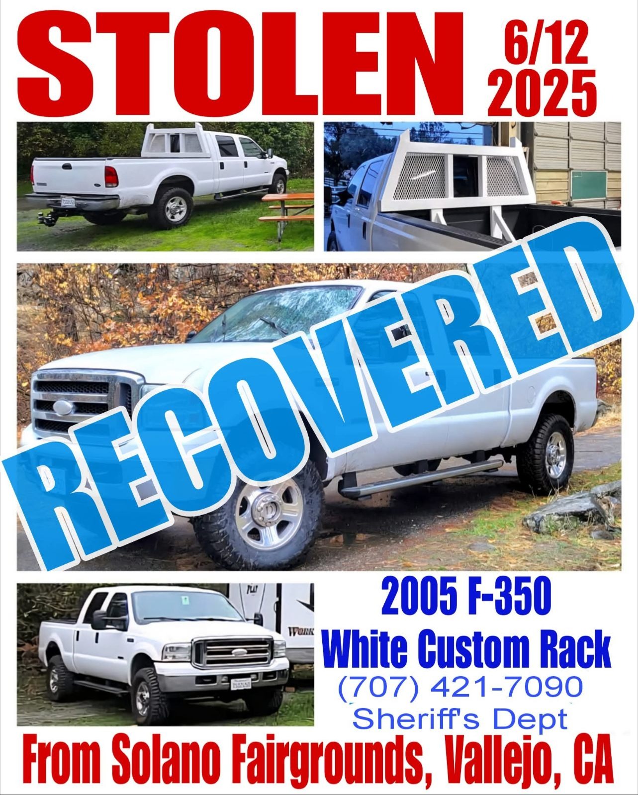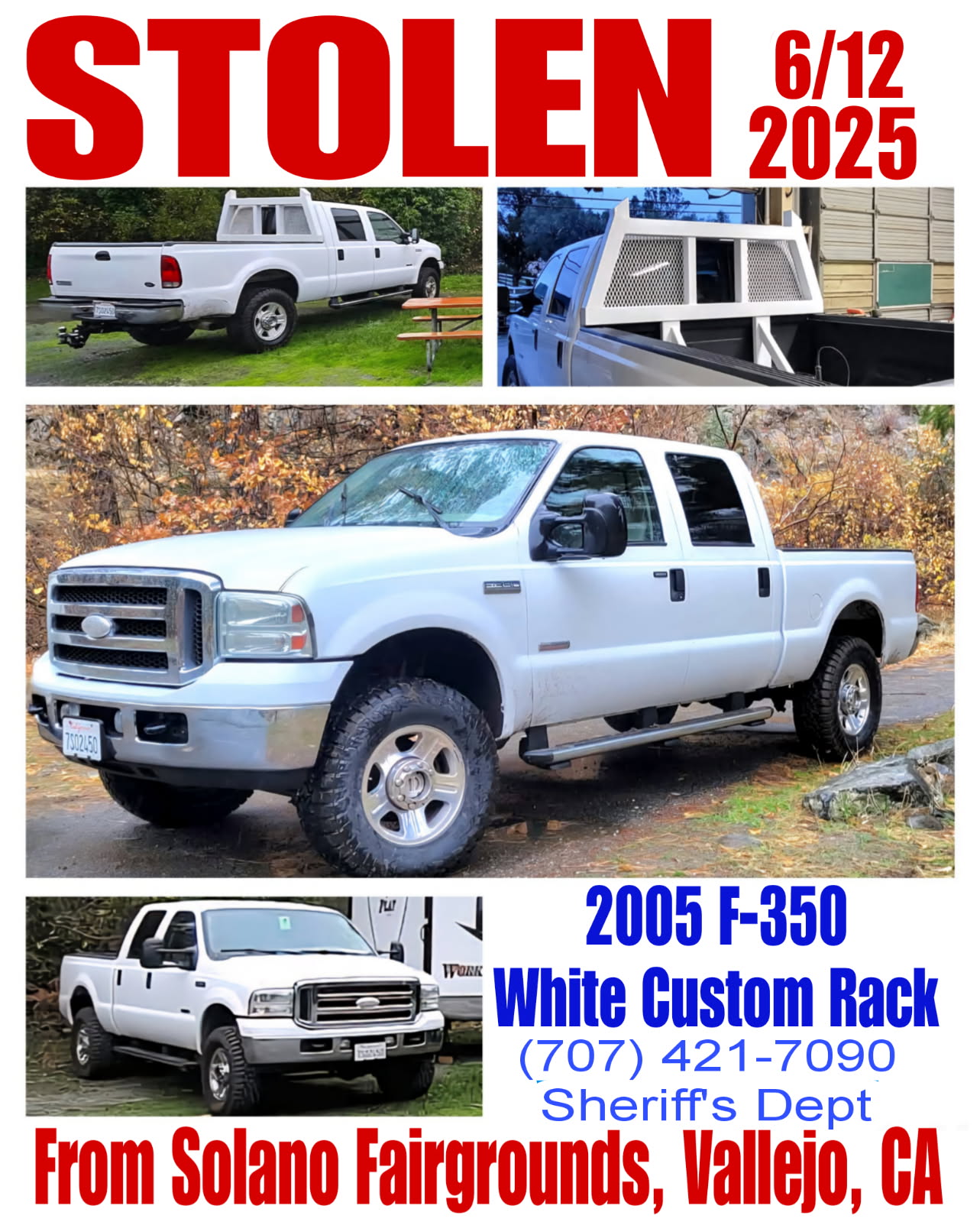 My son, Levi Brown, had his 2005 Ford F350 stolen from the fairgrounds in Vallejo while they were there to show his son's goats and rabbit projects. The thieves had the truck for 3 or 4 days before it was recovered. They stripped everything out of the bed: a 5th wheel trailer hitch, a winch, tools, and the metal cage they transport the goats in. They tore up the bed of the truck and removed the custom rack that Levi built. They punched out the locks on the doors and tore up the inside of the truck. Levi thinks it was used in an illegal sideshow. The front bumper is damaged, as is the tailgate; rear lights were busted, and the panel behind the rear tires is caved in. Levi has invested thousands of dollars into the engine, tires, and rims, and the usual things to upkeep a truck that is 20 years old. It only had 140,000 miles on it. It looks like they overheated the engine. It has fluids all over under the hood. They broke the sliding window in the back window.