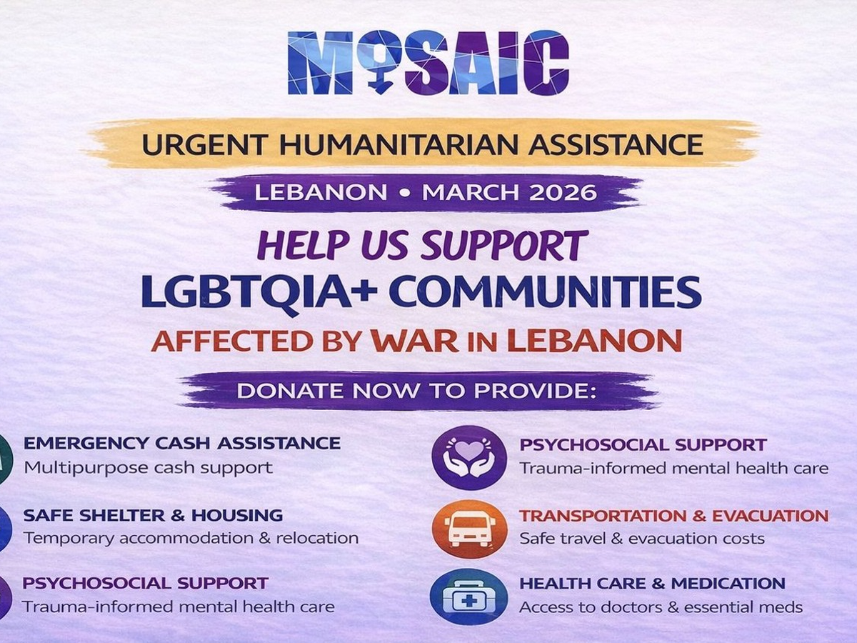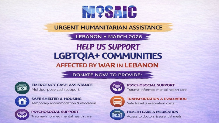 We at MOSAIC-MENA are calling on our networks and allies to support LGBTIQ individuals in Lebanon. The country is once again under an ongoing brutal war. As of March 16, 2026, the death toll has reached 886 people killed, 2,141 injured, and over 1,050,000 people displaced, according to official figures from the Disaster Risk Management Unit.