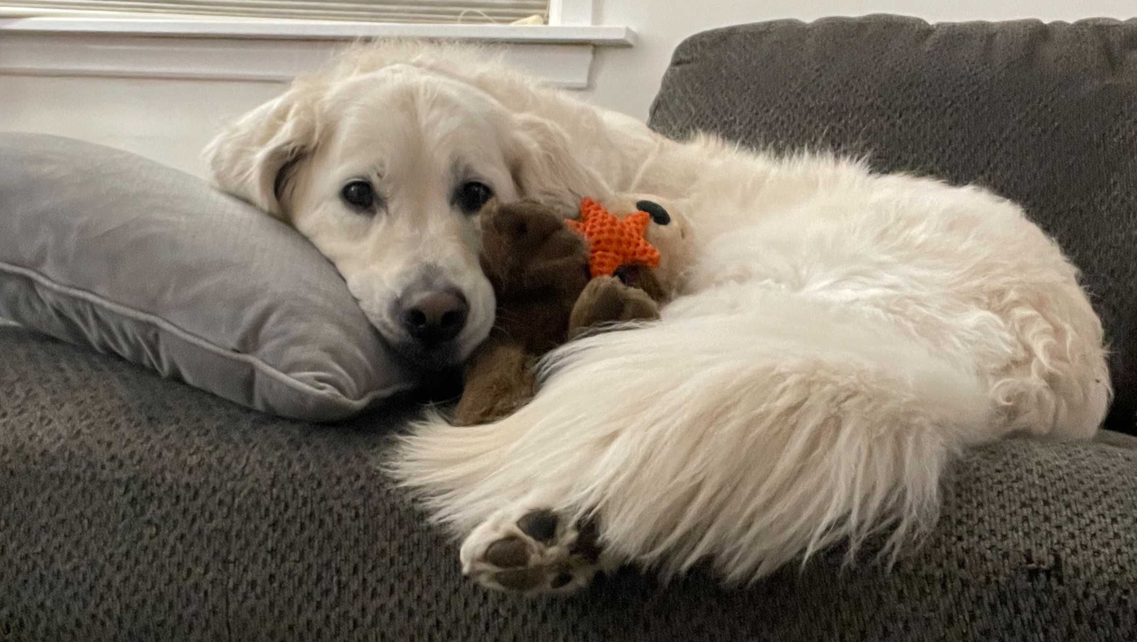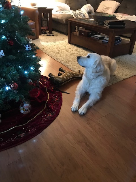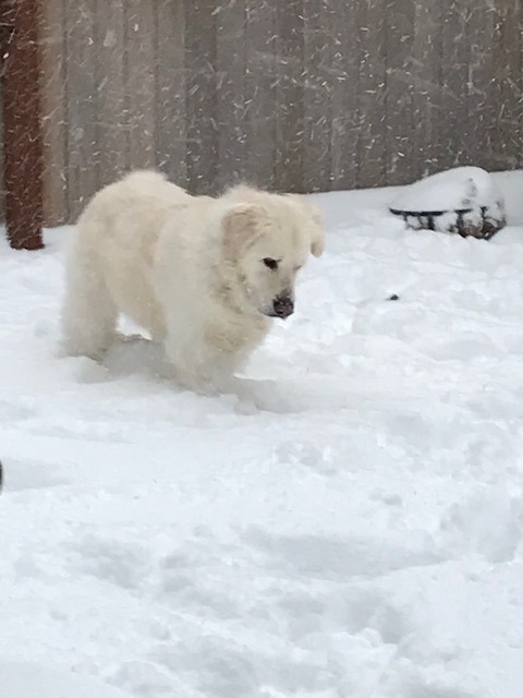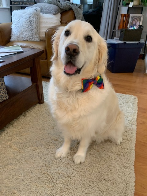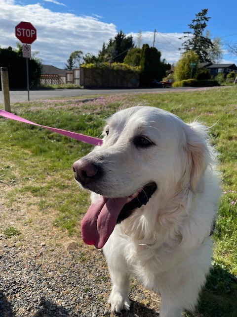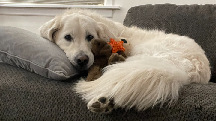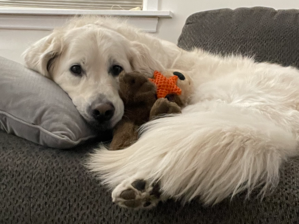 Here is a picture of Lily with her stuffed otter. A little about her is that she absolutely loves her stuffed animals and takes one with her every night to sleep. She loves catching snow in her mouth when it falls and leaping around outside. Lily is also wildly treat motivated, and once stole a sandwich when someone left the room. She loves walks, cuddles, and her people most of all.