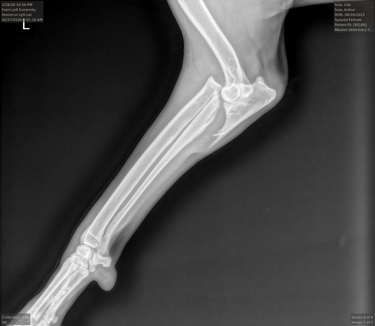 They did the exam and took x-rays and found that her elbow is dislocated and broken and told us she would need orthopedic surgery and that it would be expensive. They also said that they couldn't wrap it or do anything to help it while we worked to get a orthopedic vet appointment. Then told us that the only other options were to amputate her leg (less expensive), or to put her down. This news is crushing my heart, she is only 2 1/2 and an amazing and vibrant girl.