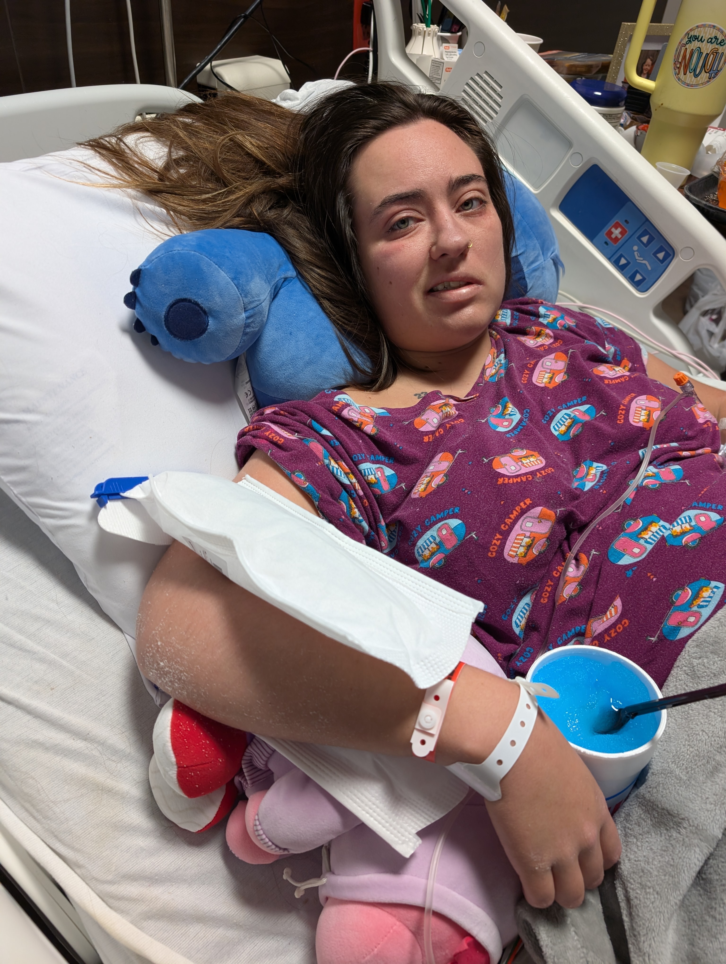 That was over two weeks ago. The hospital admitted her and diagnosed her initially with C-Diff. A horrible bacterial infection she contracted from the antibiotics she was on when she had the UTI. Since then, her white blood cell count has dropped to 0.7 and has continued to see-sawing between 0.7-1.6. When you have an infection, your white blood cell count is supposed to go high like 11 - 13. Hers did the opposite. She has the same immunity system that a chemo patient has and they don't know why yet. They have guessed but no sure answers. She has sepsis which means the infection is in her bloodstream. They cleared it after the first 7 days and then on day 9 they said she had sepsis again.Then she developed another secondary viral infection of some sort. Then a yeast infection. On top of all of this, the left side of her face has become paralyzed. They said it wasn't Bell's Palsy and now they are saying it might be Bell's Palsy. Her lymph nodes are so enlarged everywhere. Now, the IV in her right arm has blown her vein and now her arm is so infected that they might have to do surgery on it to drain it.