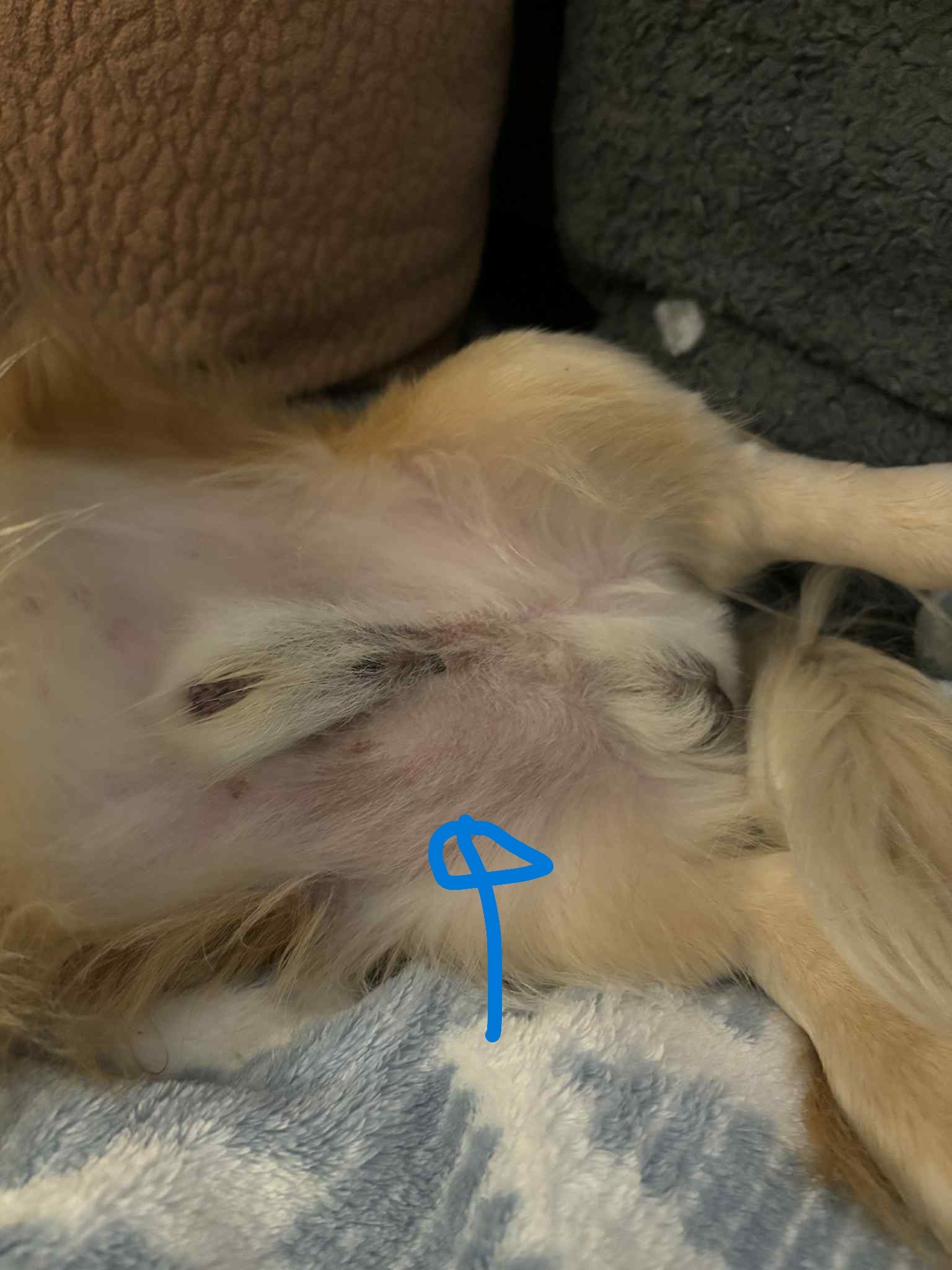 In early October 2025, a veterinarian in Michigan discovered a small hernia near Luke’s abdomen. What started as a soft, squishy bump has since grown significantly, becoming firm and uncomfortable, especially when Luke tries to rest or sleep. Luke hasn't been able to do his cute donut cuddle. He has increased urgency to use the bathroom, showing that the hernia is worsening by pressing on his bladder, creating small leaks once in a while. The pictures displayed are from months/year before the hernia, discovery of hernia, and as of 11/4/2025 hernia.