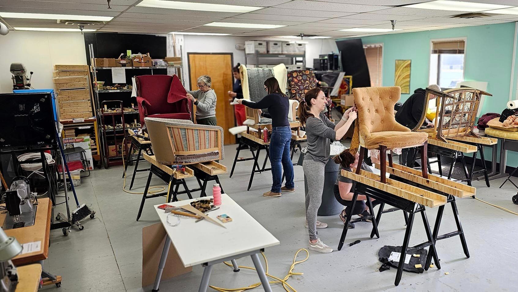 The Vision for the New Space: This isn’t just a shop, or community work space. It’s a furniture and design studio where people can learn, create, and connect. When you walk in, you’ll feel the energy of a tattoo shop or alternative hair salon—cool, vibrant, and inspiring. Large windows showcase the activity inside: artists at work in the 'Chair Salon', customers browsing furniture, fabric, tools, and supplies, while students learn the craft of upholstery.