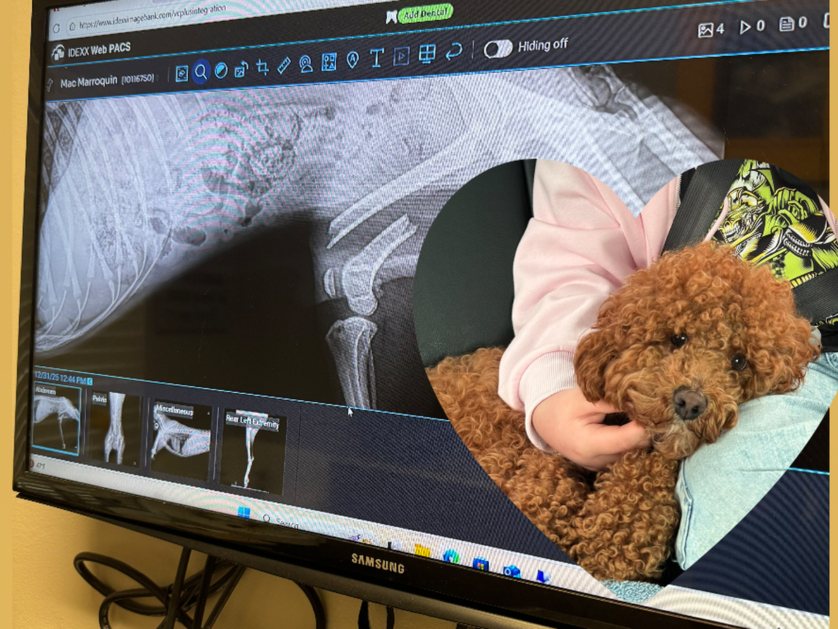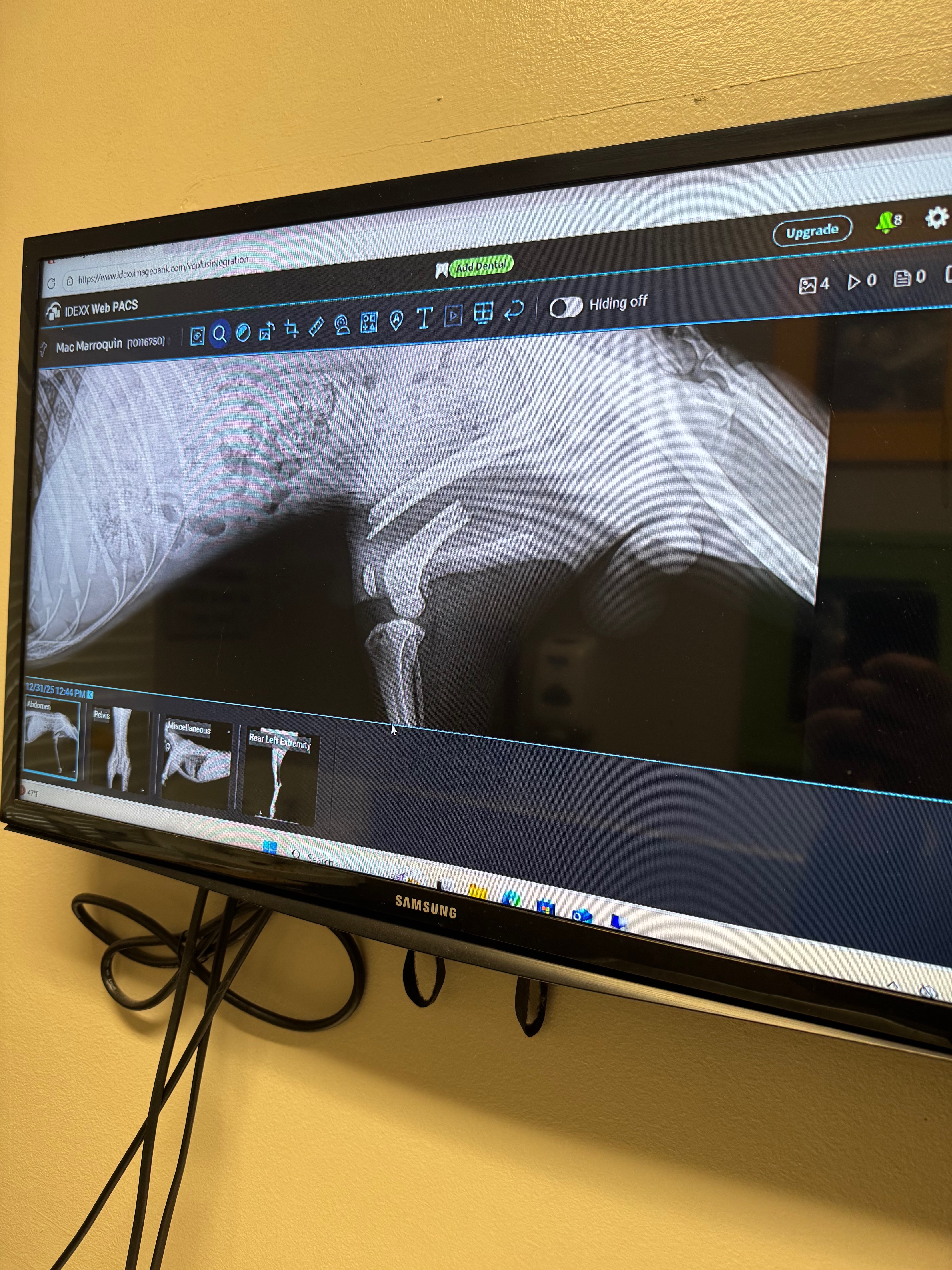 This is Mac and Mac’s leg. Mac joined us unexpectedly just 2 days ago on December 29th. His previous owners were going to surrender him if they could not find someone to take him. We were told he was limping because of an accident that no one witnessed. Mac showed no signs of pain and allowed you to touch his leg. We were shocked when the x ray showed that insane fracture. Mac needs a rod inserted into his femur, as it starts to heal he will have it removed. He’s looking at a couple months of recovery time. It will be around $3500 for the procedure and meds needed.