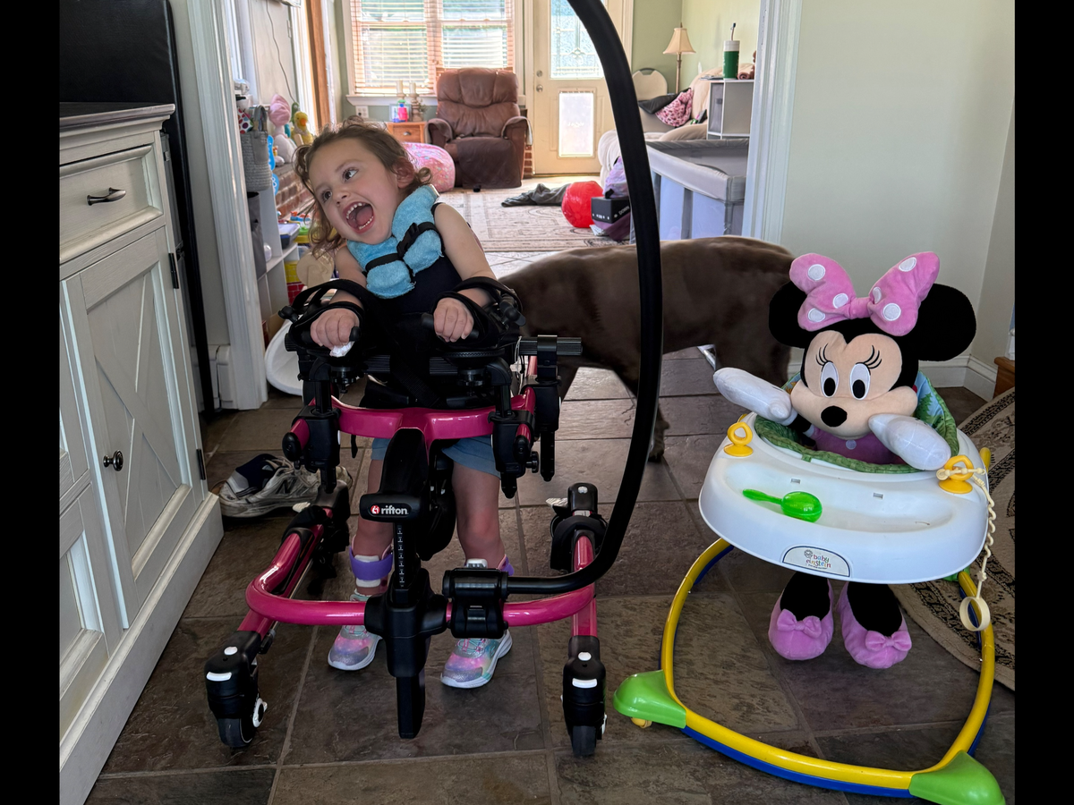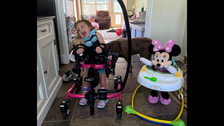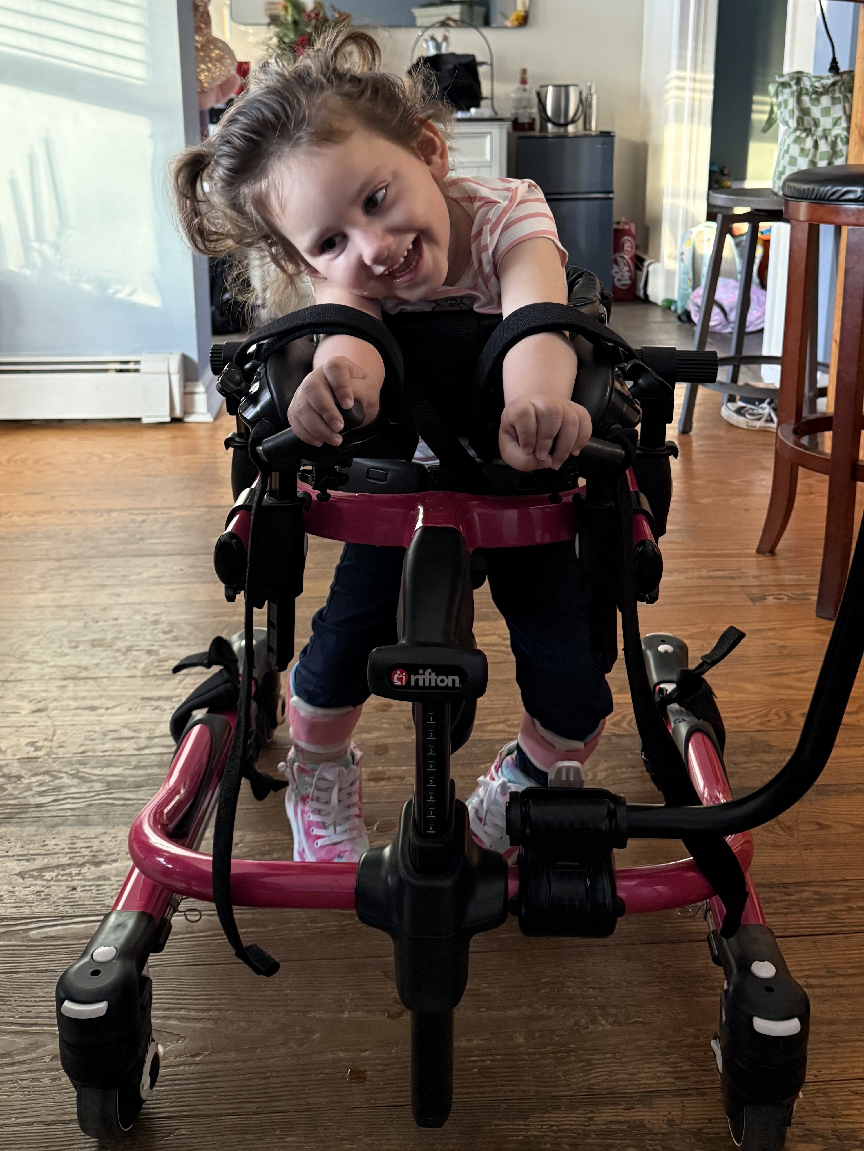 She has already completed three DMI therapy sessions and is making incredible progress — she’s taking steps in her gait trainer and learning to sit up on her own. These milestones bring our entire family so much hope.