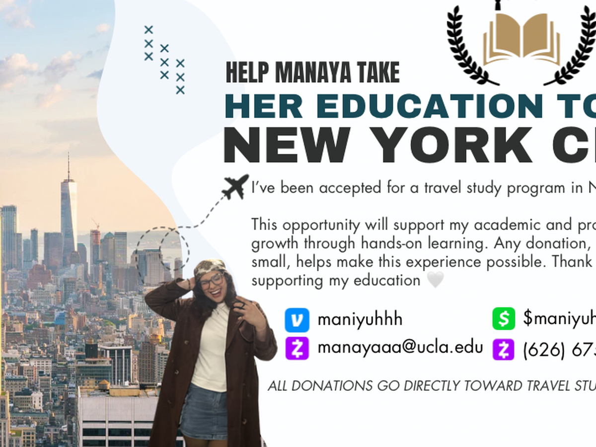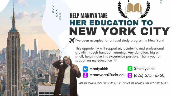 Mi nombre es Manaya y soy estudiante de primera generación en UCLA. Me acerco a ustedes porque este verano tengo la oportunidad de participar en un programa de estudios con viaje a Nueva York, lo cual para mí representa una oportunidad única para concluir mis clases / mi último año y vivir una experiencia completamente nueva.