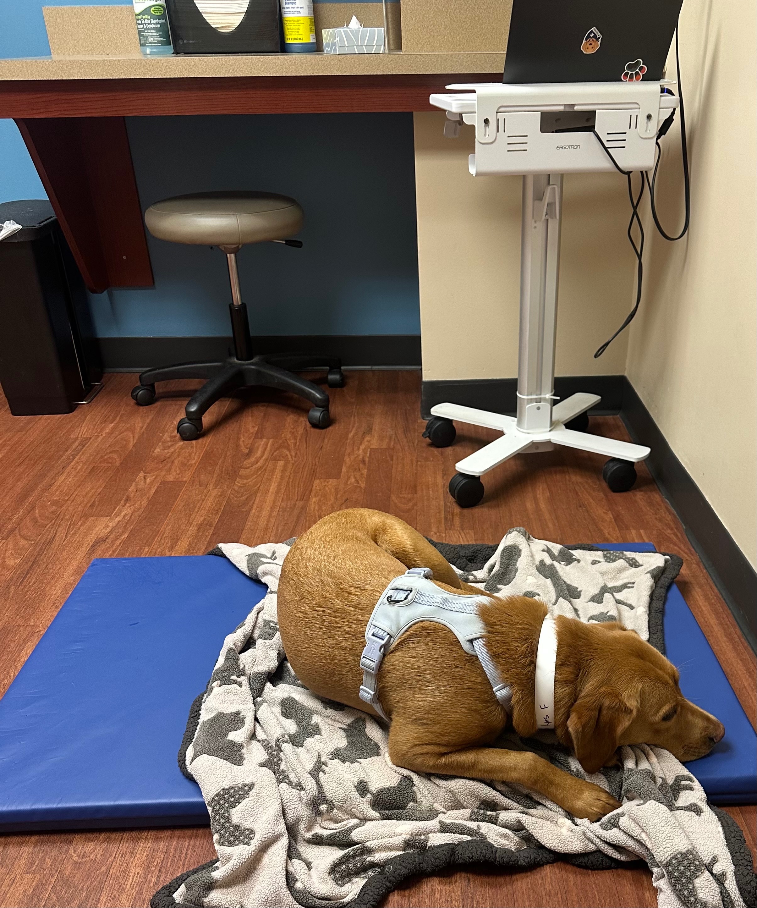 Over the past few days, she’s been at MedVet after initially showing signs of what they thought was a simple soft tissue injury. She wasn’t acting like her usual happy, playful self; no running around, no playing with her sister Mabel. During her first visit, the doctors noted back and abdominal pain and believed she may have injured her back during play. She was sent home on medications and strict rest, but unfortunately, she didn’t improve.