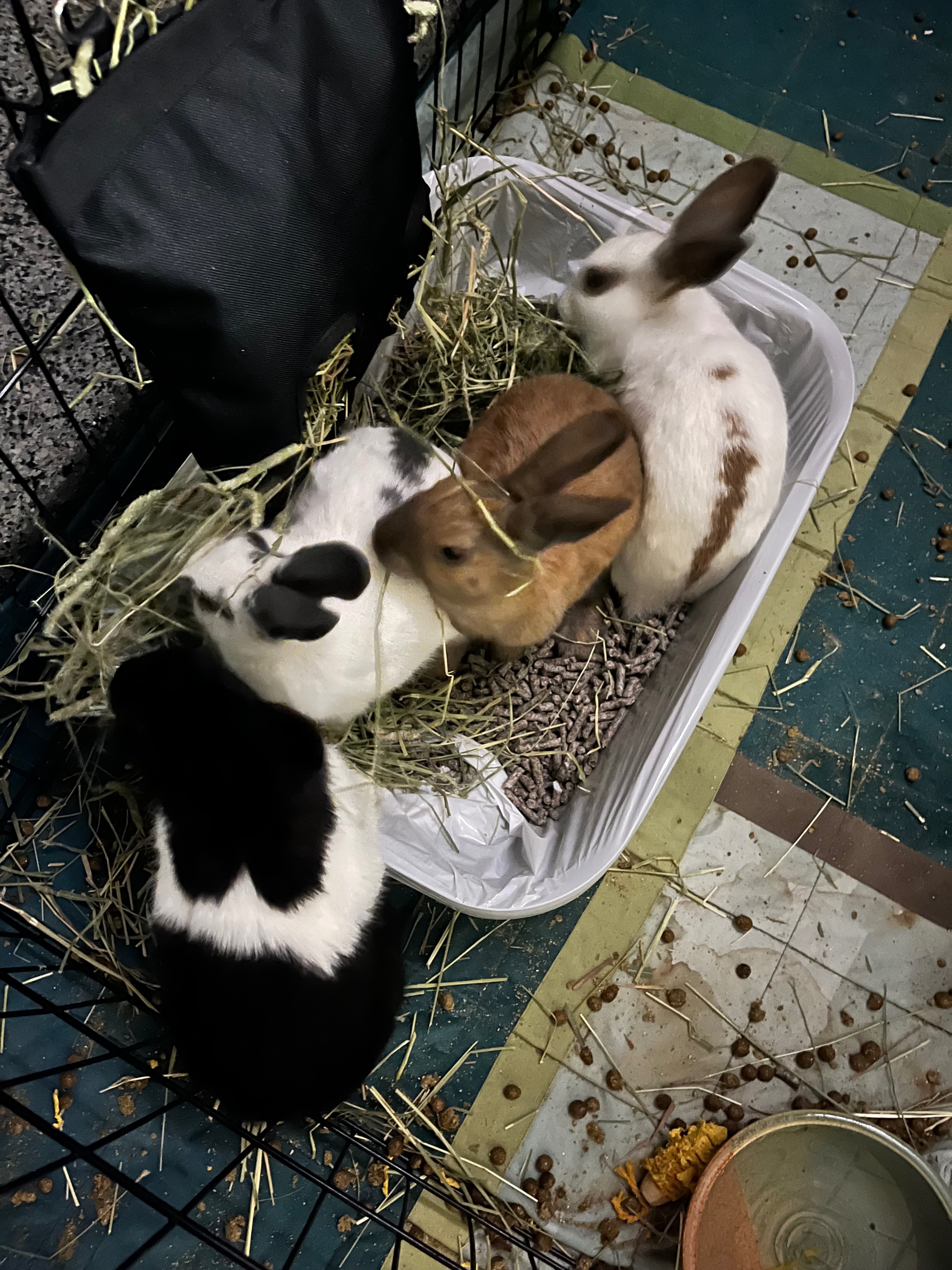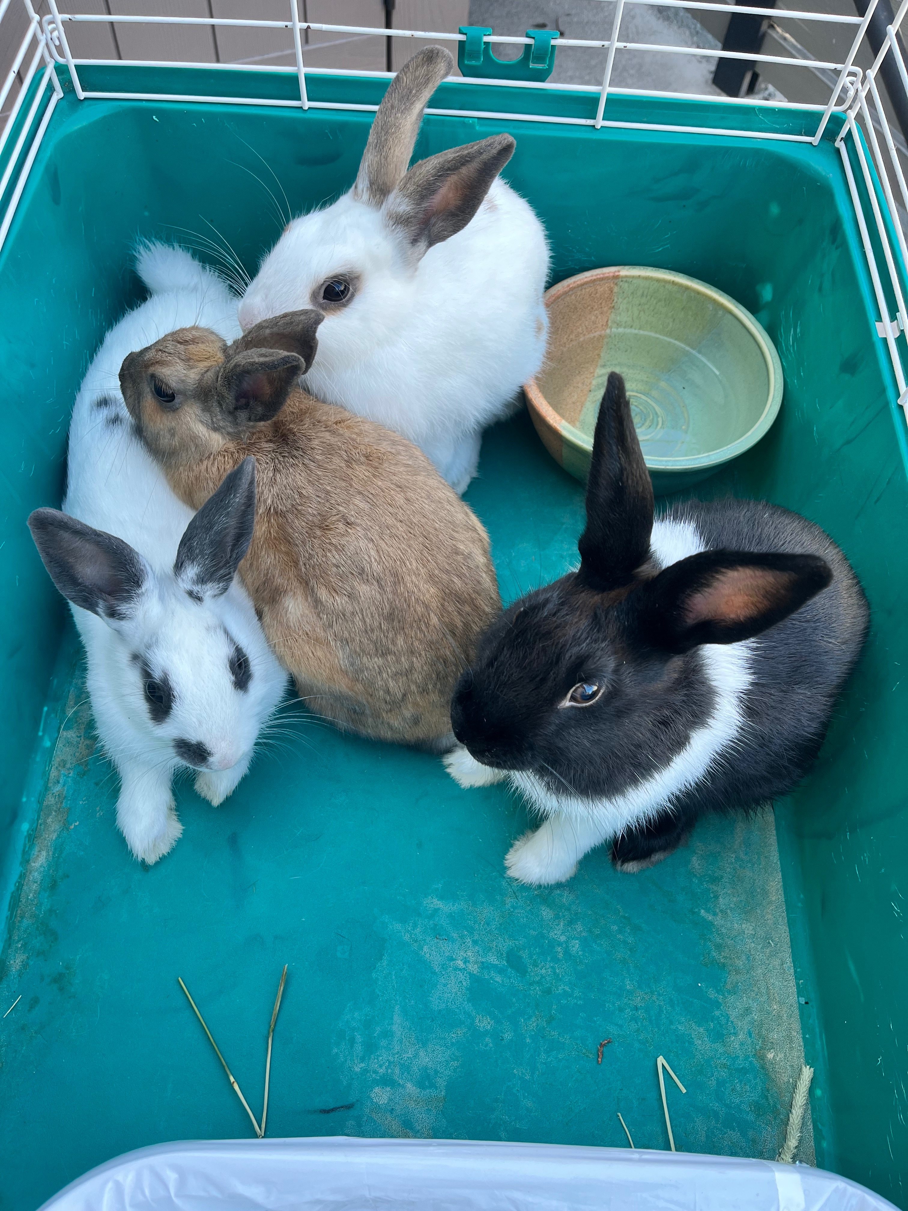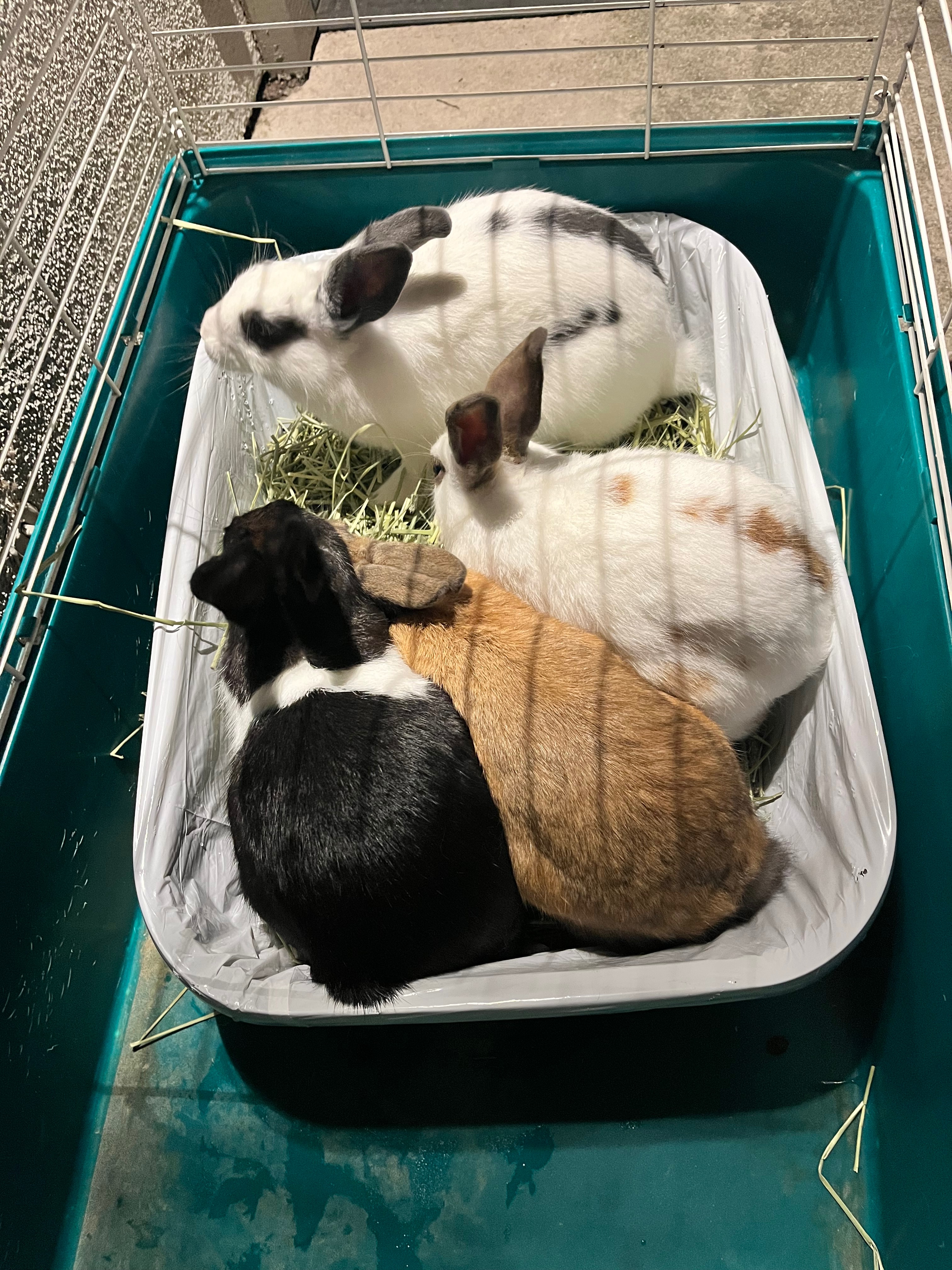 Three weeks ago we found four baby domestic rabbits dumped in nearby Sandpointe park. A fellow walker had found them shortly before we walked up and they were hiding in some bushes with a pile of pellets dumped beside them (of course no water..). Between the four of us, we were able to catch them and we brought them home hoping to drop them off at a rescue that day. Unfortunately, this ended up being a taller task than we had expected as all area rescues are completely full and overwhelmed with unwanted rabbits. While our local shelter must take them, we are hoping to avoid this option as the shelter is also inundated with rabbits and we don't want them to fall through the cracks or be separated if we can help it. Additionally we want to ensure they end up in responsible homes that understand the commitment associated with a rabbit to prevent future rehoming or dumping.