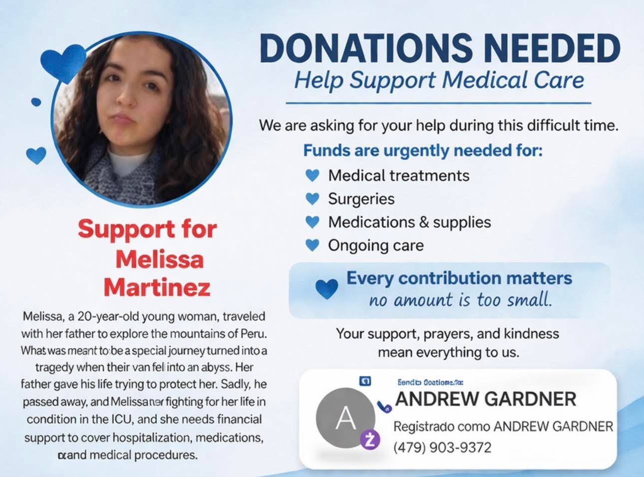 Hello everyone, I’m reaching out with a heavy heart to ask for your support for my sister. My 20-year-old sister Melissa, the youngest of three daughters, traveled with our father to explore the mountains in Peru. What was meant to be a special journey turned into a tragedy when their van fell into an abysm. Our dad passed away, and Melissa is now in the hospital fighting for her life. She is currently in the ICU after a serious accident and is fighting for her life. She remains on a ventilator, and we are praying for a miracle so she can breathe on her own. She has a spinal cord injury and will need surgery soon, followed by long-term therapy for her recovery. Unfortunately, her insurance is very limited and does not cover all the expenses. We are doing everything we can, but we cannot do this alone. Every cent counts, and any donation would mean the world to us. If you’re unable to donate, please consider sharing this message.