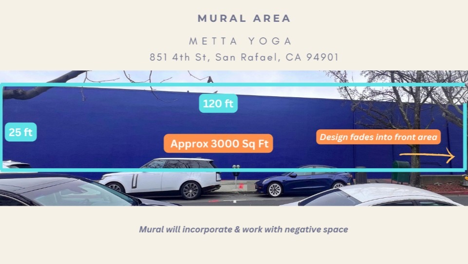 Metta Yoga San Rafael has been selected by the City of San Rafael Downtown Business Improvement District for a Mural on our wall! The City of San Rafael awarded us a grant of $4,000 for this project. We need to generate an additional $8,000 to complete the project.