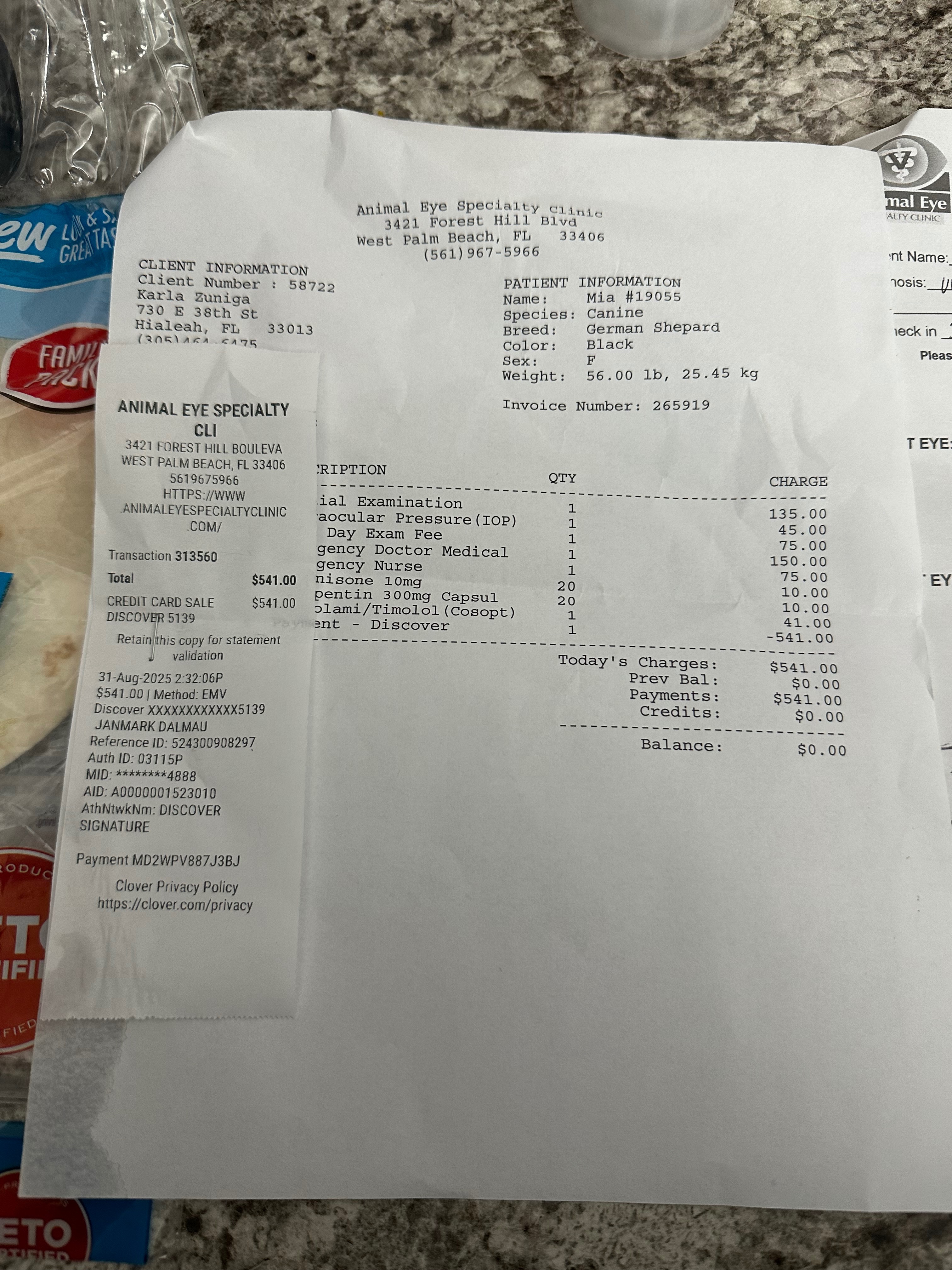 Unfortunately, things took a turn when I came home yesterday, 8/30. Mia’s eye look hazy and blueish. It was very strange because before I left she was looking her normal self and had regular eyes. I contacted a live vet, who recommended to take her to the ER, due to her not following her toy with her eyes, having discharge and that weird looking appearance of haziness.