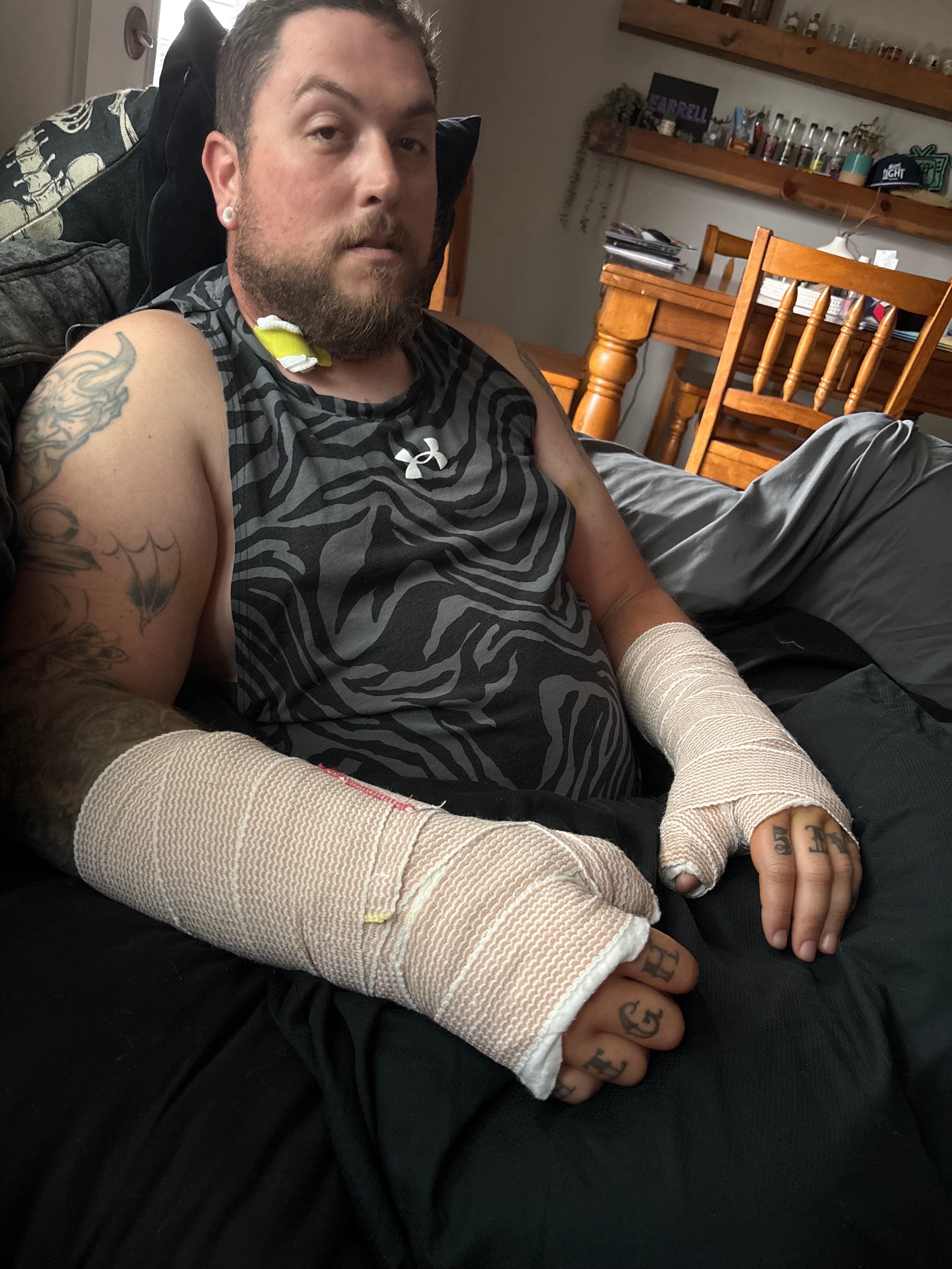 Unfortunately, he is going to be out of work for a minimum of 6 weeks and is going to require extensive therapy to allow him to re-learn how to use his right hand.