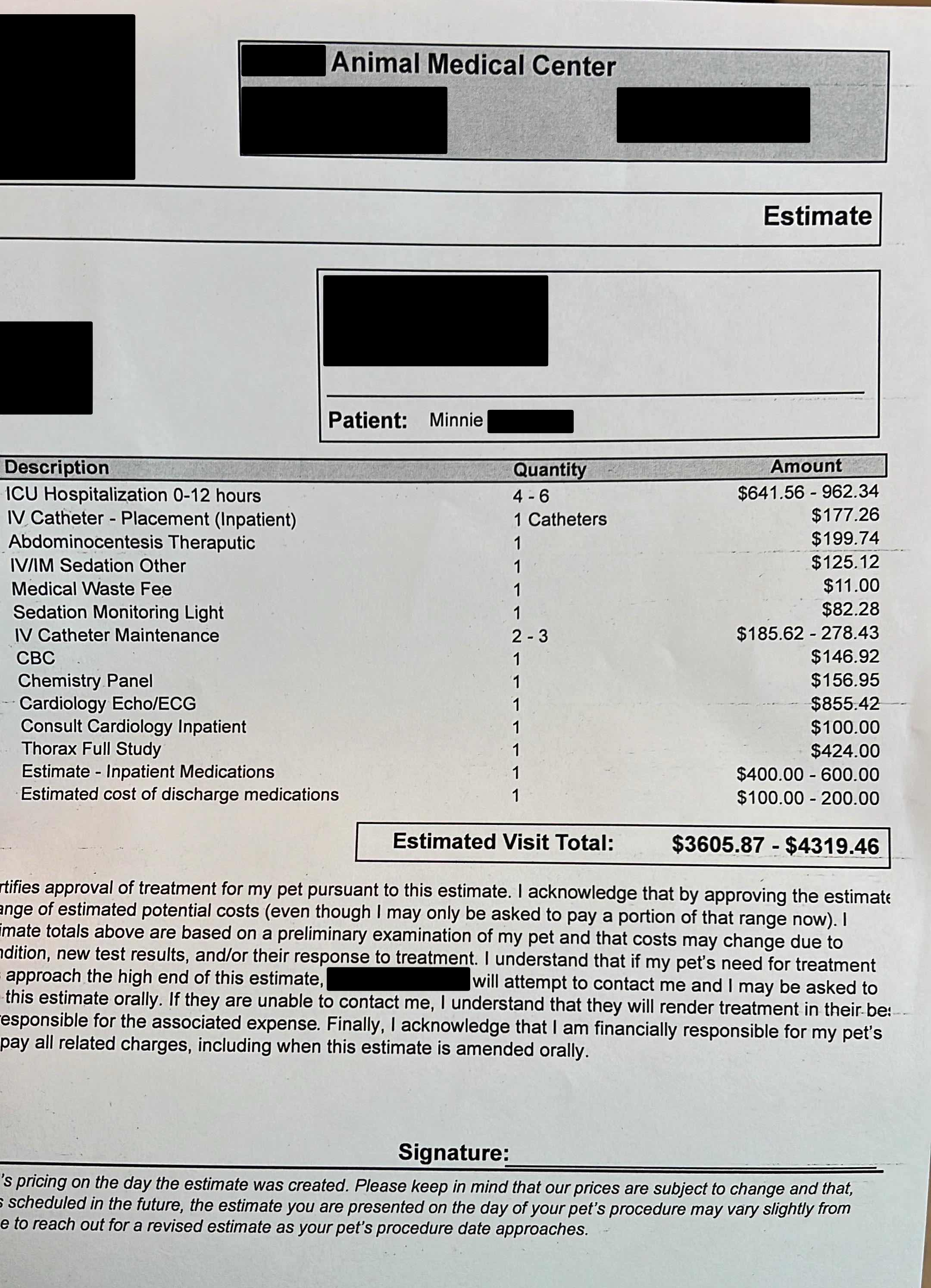 The costs for treatment, which includes monitoring, ultrasounds, blood work, medications, and more could go up to an estimated total of over four thousand dollars; $4,319.46 was the given estimate on the invoice.