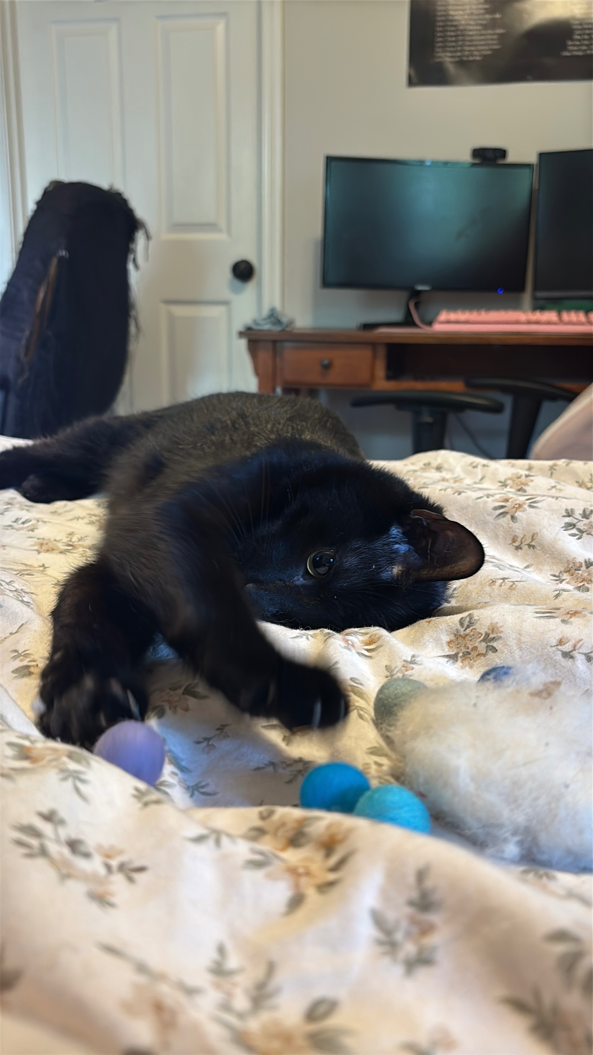 We originally were just going to foster them, but we couldn’t find anyone willing to take 2 feral kittens, and we refused to separate them. So we just ended up keeping them, which of course we don’t regret! We adore them and they are such lights in our life.