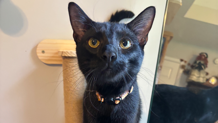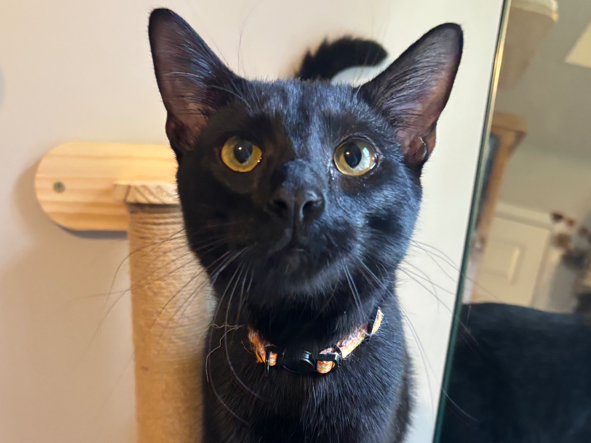 We found Monster and her sister, Mavis, next to a busy road in a bad part of town all alone. They were 12 weeks old max and feral. We managed to catch them in catch-and-release traps, and the rest is history.