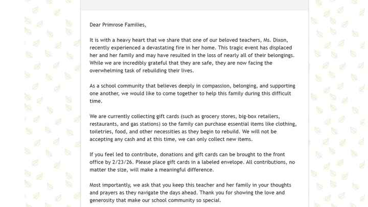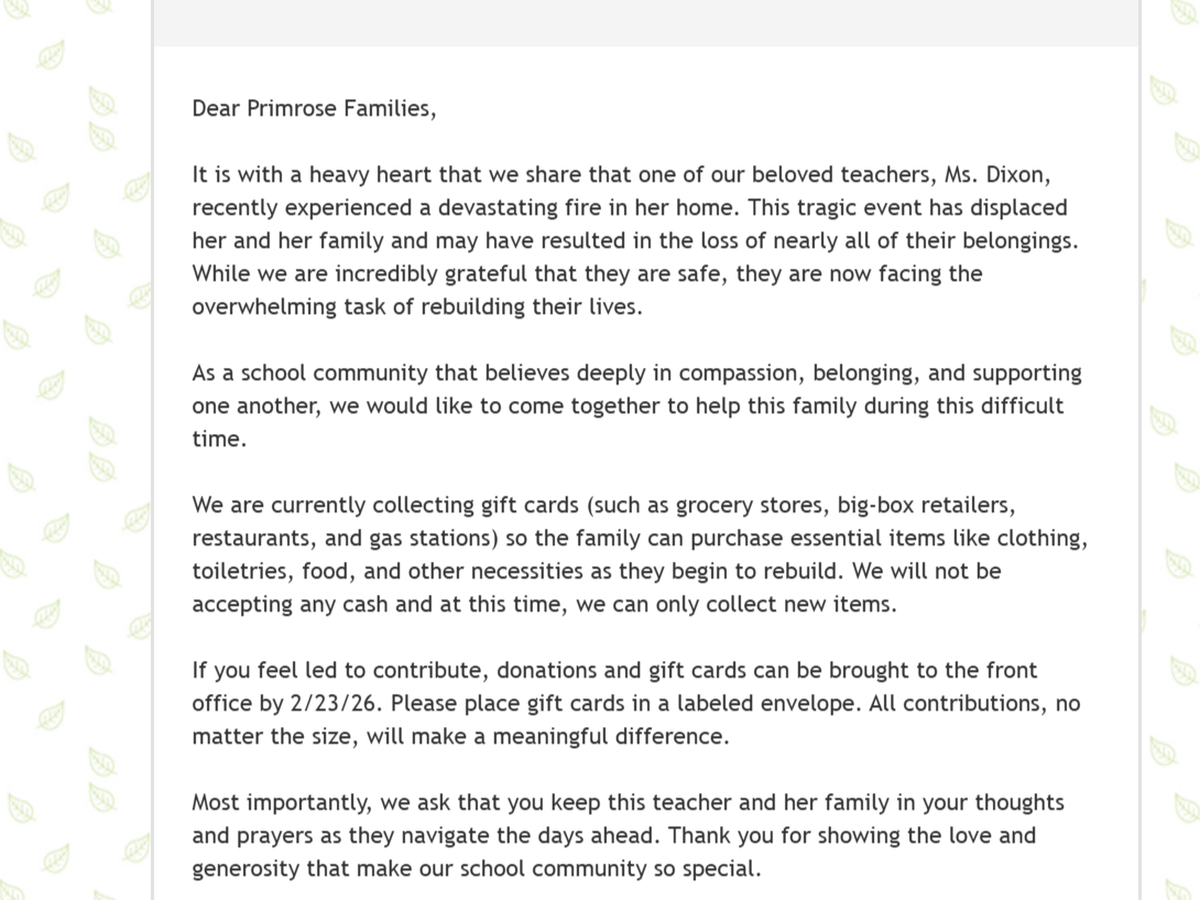 It is with a heavy heart that we share that Ms. Dixon and her family recently experienced a devastating fire in their home. This tragic event has displaced them and resulted in the loss of nearly all of their belongings. While we are incredibly grateful that everyone is safe, they are now facing the overwhelming task of rebuilding their lives from scratch. The road ahead will be challenging, but as a school community that believes deeply in compassion and support, we want to come together to help Ms. Dixon and her family during this difficult time.