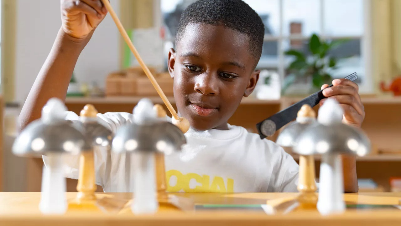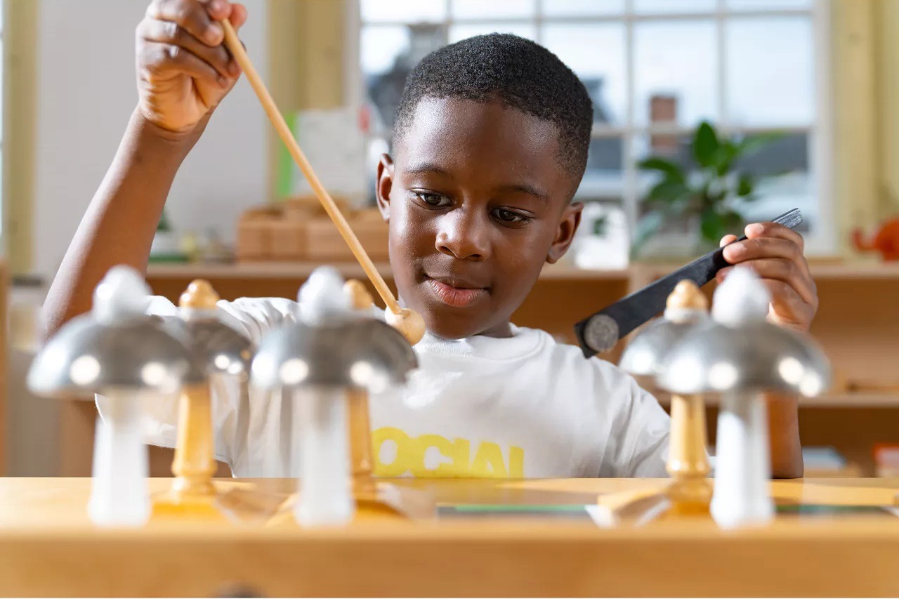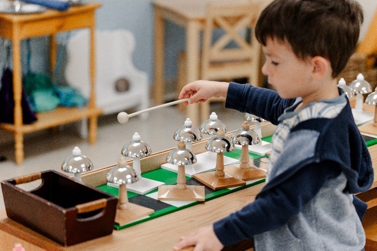 The Musical Bells provide the child with a sensorial experience to develop their auditory sense by isolating the quality of pitch. The children experience the progression of sound through the vibrations and develop more awareness of vibrational changes. The bells also offer the child opportunities to use music for personal expression. As the children work with the bells, they move, manipulate and work through gradation, experimenting with the vibrations of the sounds they hear.