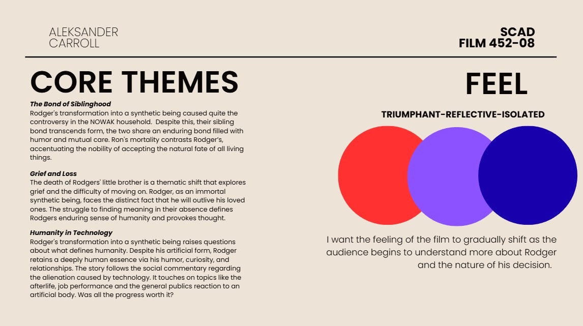 The film’s story is close to my heart. It follows Rodger, the world’s first cyborg, who must face the tragic irony that the technology he helped pioneer has now eclipsed him. The inspiration for this film comes from my relationship with my brother and our different perspectives on technology and mortality. While my brother would embrace becoming an immortal cyborg, I’m more comfortable with the idea of life’s natural end. This led me to explore the emotional and psychological impact on an older cyborg brother who outlives his younger, human sibling. The film delves into themes of siblinghood, humanity in technology, and the experience of grief and loss.