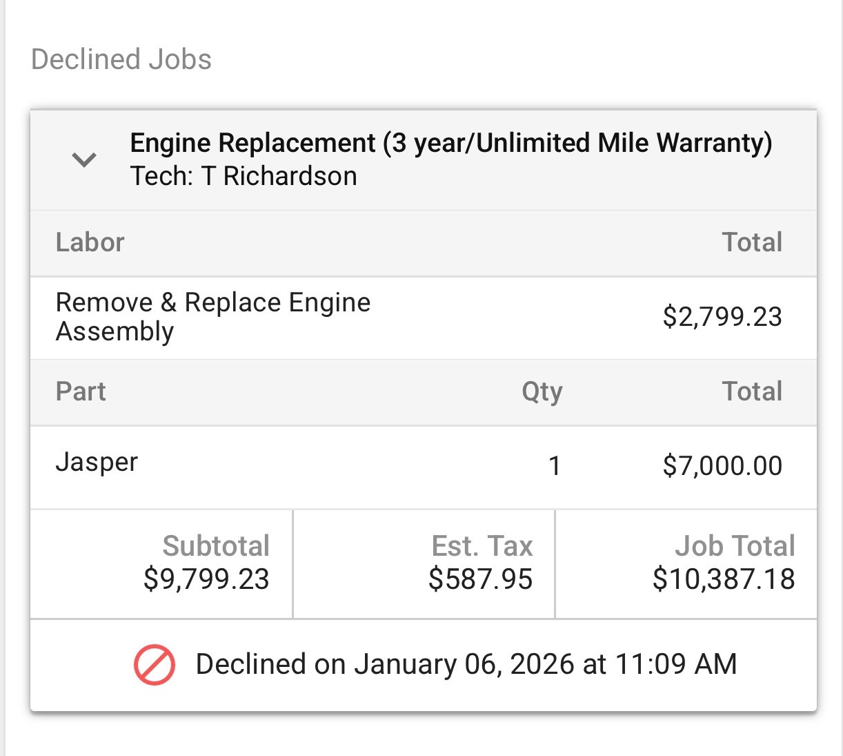 As of Sunday, 1/4, the car went down yet again. We sent it to a shop for full diagnostics as it wasn’t anything easily identifiable with basic diagnostics. Today, 1/6, the shop reached out and explained the timing has gone out and has thrown metal, which ultimately means the entire engine is done and needs to be replaced. The shop quoted $10k in repair for the engine swap and labor, as pictured, which we denied the job as we purchased the car for just over half that cost.
