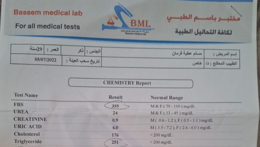 This is medical result for diabetes. He is supposed to be eating specific types of food, but is unable to due to the war.