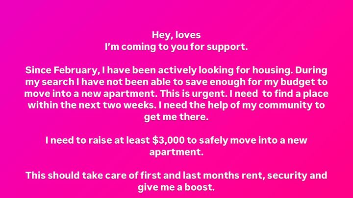 Hey, loves! I’m in a pickle. I need to raise $3,000 to raise money for rent. Since February, I have been looking for affordable housing. This $3,000 will cover first and last months rent along with security. I am an active performance artist living in NYC. I work hard.