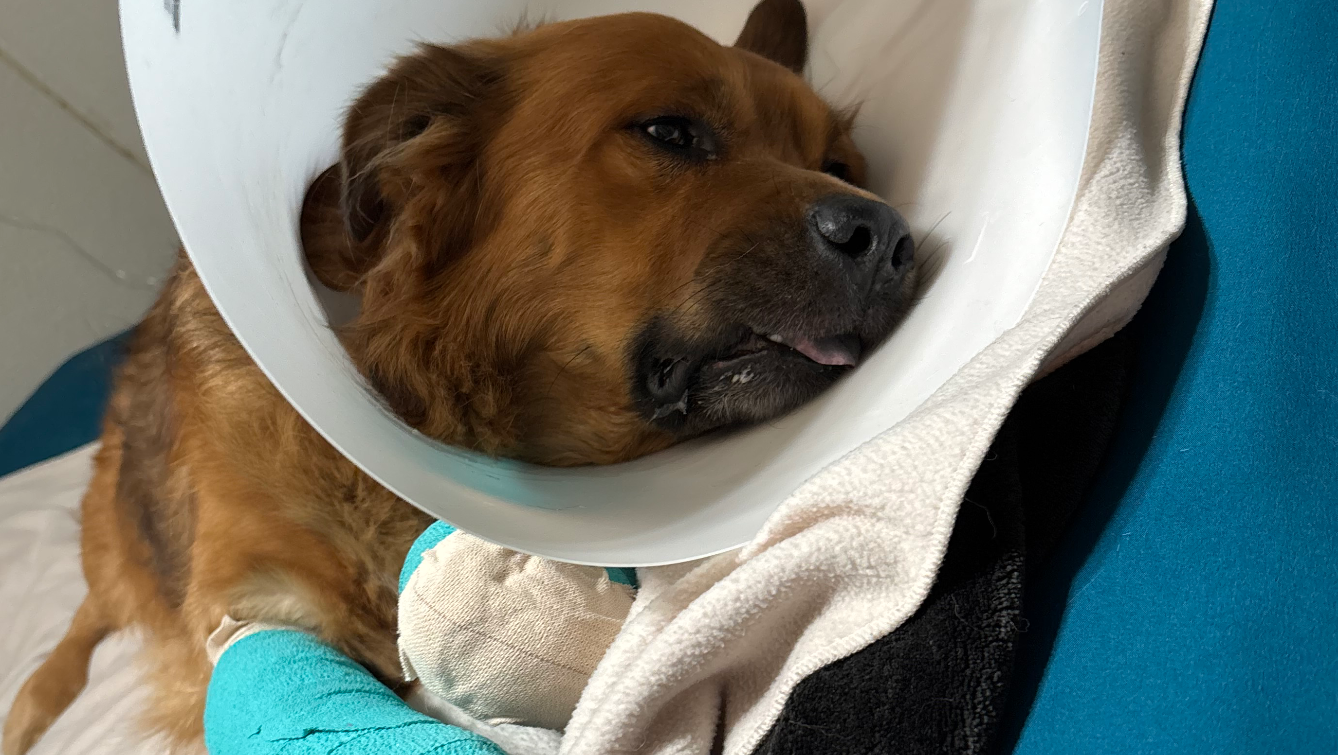 This is Dosha, our sweet 10-year-old boy who's my absolute world! He's my registered service dog who's with me every day. Yesterday, he jumped off of our two-story balcony and broke four metacarpal bones in his right foot and a broken proximal metacarpus bone in his left foot. He will need surgery to fix both of his feet to help him walk normally again without any lameness or limping.