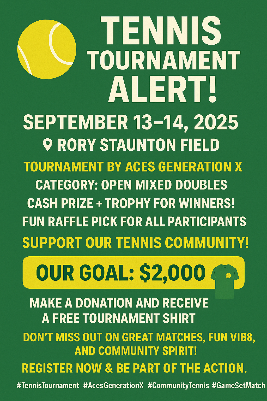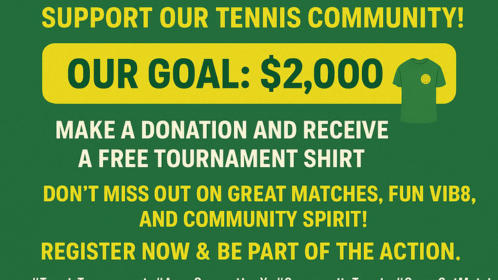 Help us raise $2,000 to host a community tennis tournament! Your support will cover equipment, prizes, and event costs, bringing people together, promoting fitness, and fostering local talent. Every contribution makes a difference—join us in creating a fun, inclusive event Thank you!