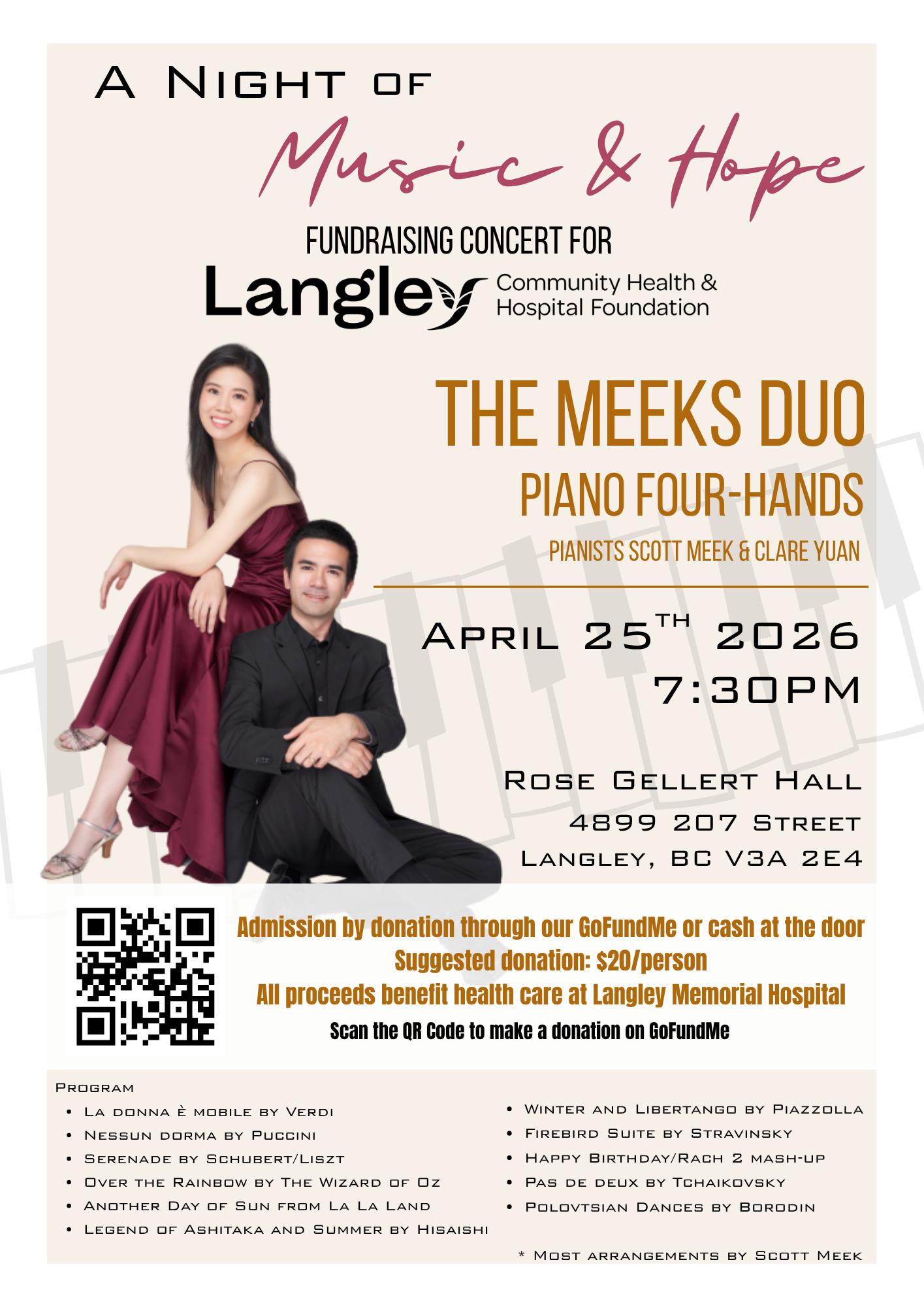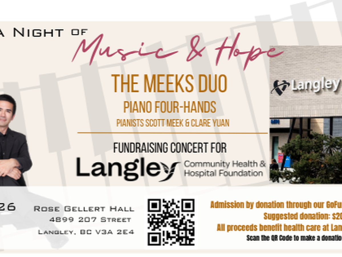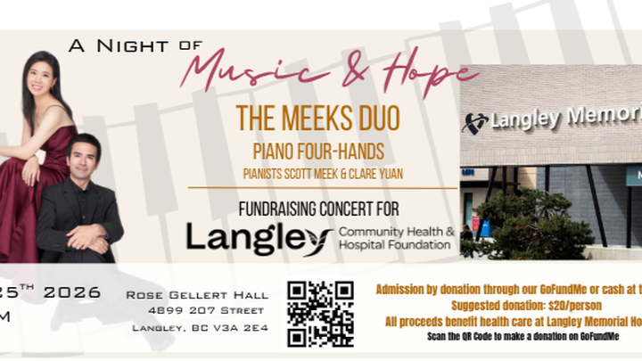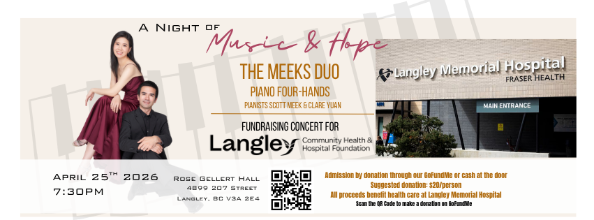 The Meeks Duo, pianists Scott Meek and Clare Yuan, will be holding a fundraising concert on April 25th 2026 at 7:30PM for the Langley Memorial Hospital at the Rose Gellert Hall in Langley.