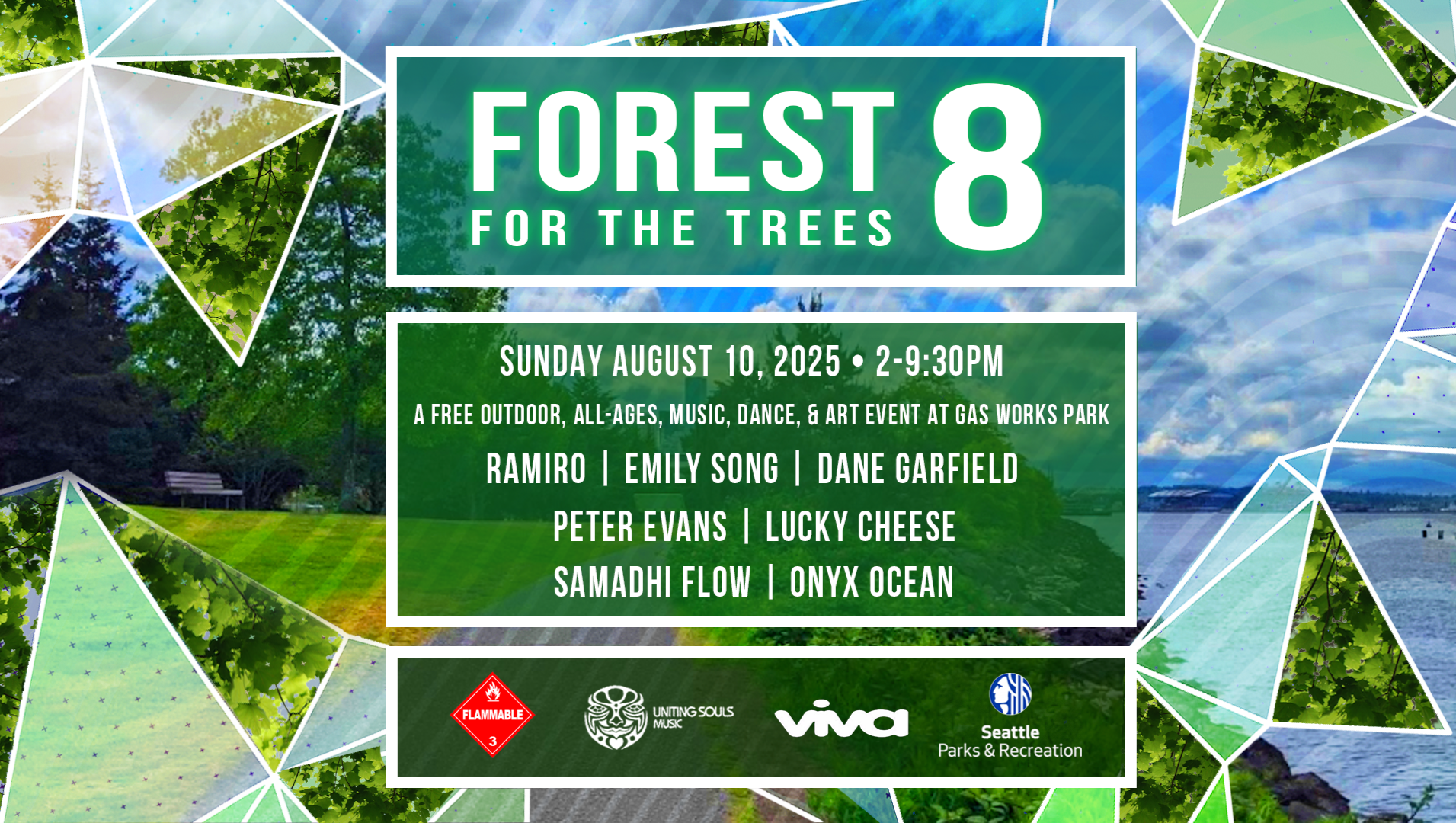 We are delighted to invite you and your families to our 8th annual free party in the park! Join us on Sunday August 10th, 2025, as Flammable, Viva, and Uniting Souls team up to present Forest For The Trees 8- a daytime gathering, starting at 2pm, with djs & dancing until 930pm. This event will be held at beautiful Gas Works Park, on the shores of Lake Union, with beautiful views of the lake and the downtown skyline.
