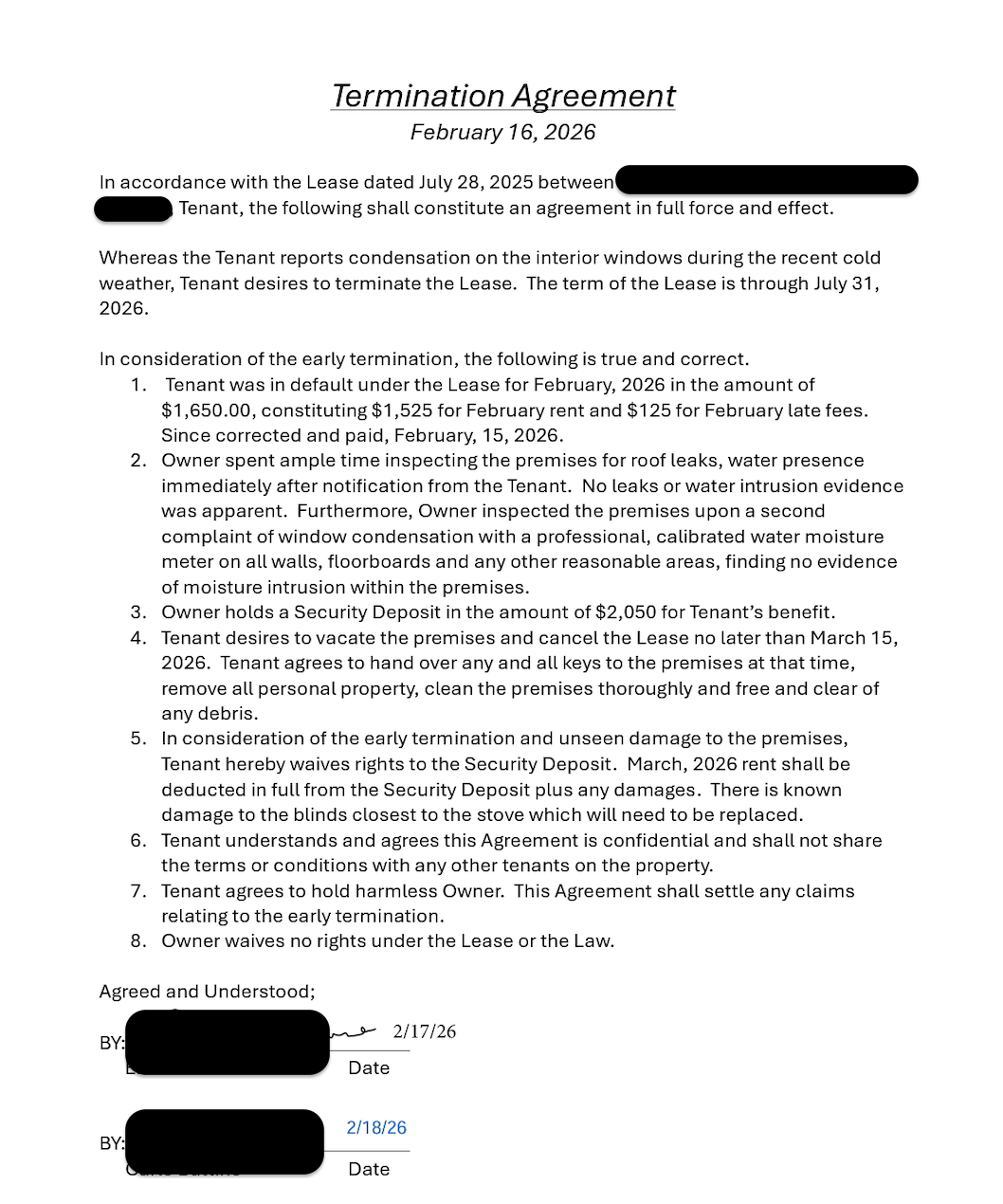 The only thing our landlord did was wipe it away with clorox bleach wipes, and try to deflect the mold issue while claiming it was condensation and that he was at no fault. He told me that in order to break the lease, and leave, I would need to forfeit my deposit, and sign a confidentiality agreement, stating that I wouldn't talk to the other tenants on the property about it.