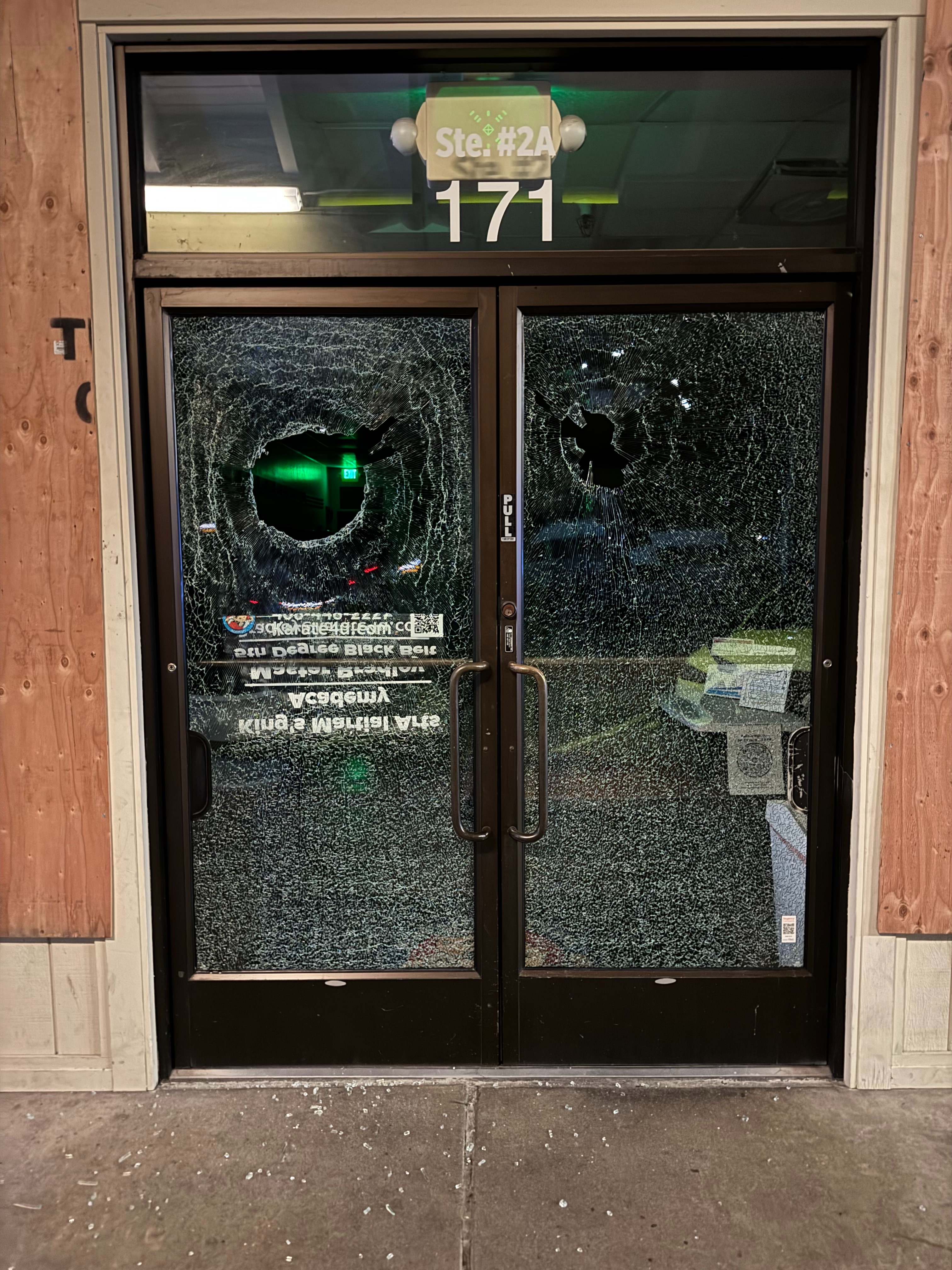 Later that night, I got a call at about 11:15 PM, which never happens that late in the evening. I quickly checked our security cameras and sure enough, the man had returned to throw two small stones through our large 5x7 windows. Luckily, no one was in the studio and no one was harmed. My wife and I arrived at the studio at 11:30 PM to assess the mess, file a police report, and clean up the damages in preparation for the next day full of classes. We left at about 3 AM, windows boarded up and all glass cleaned thoroughly from the mat and business.