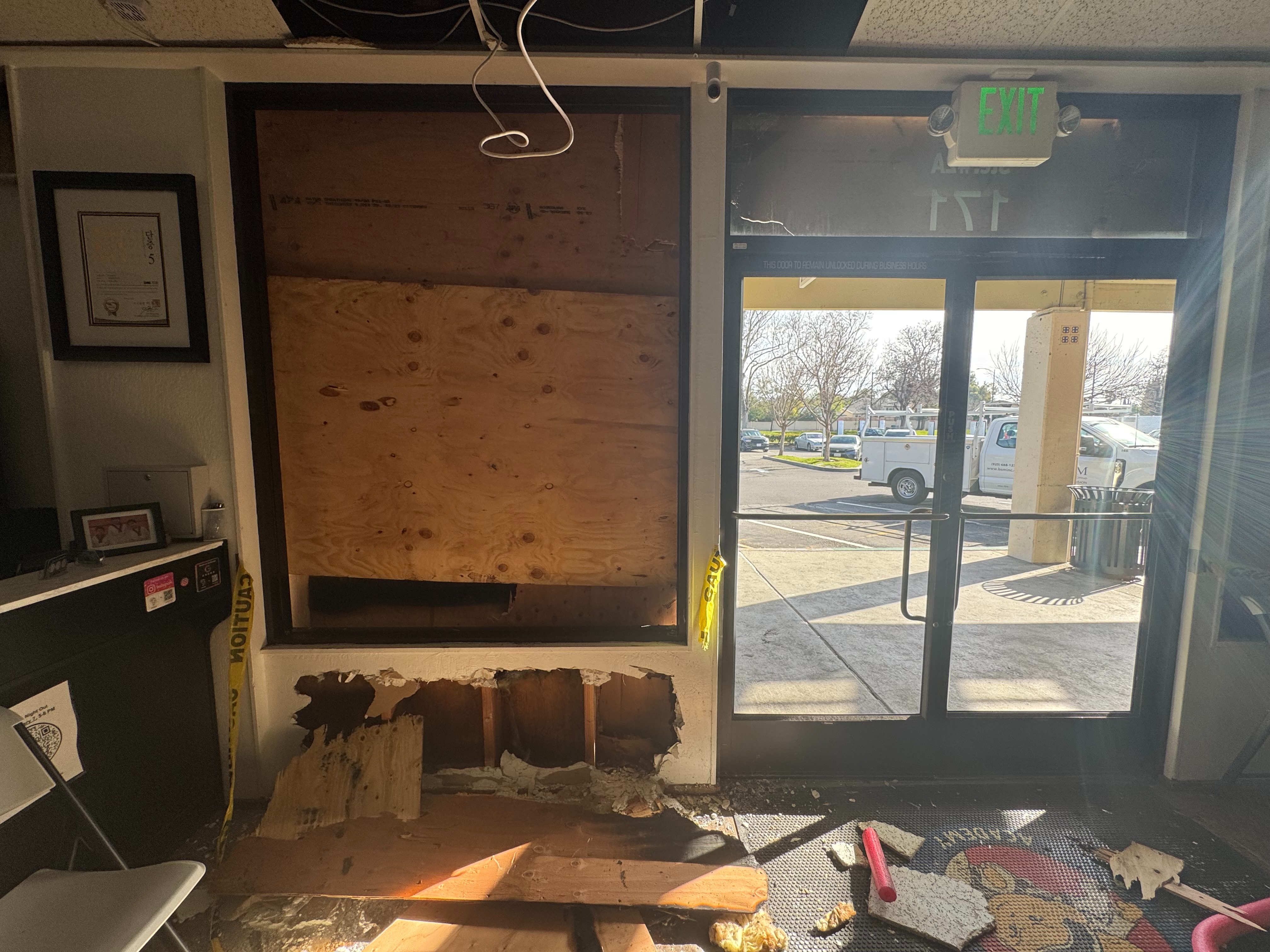 9:28 I arrive at the studio, thanks to a nearby parents email, to once again assess the damages. Deflated, my wife, inlaws and I work on cleaning up the mess as well as boarding up ALL windows and the doors to avoid further damages until the offender is caught. Please see the photo below of the studio the evening of 1/29. Officers were able to write us a police report yet the offender was not to be found that night.
