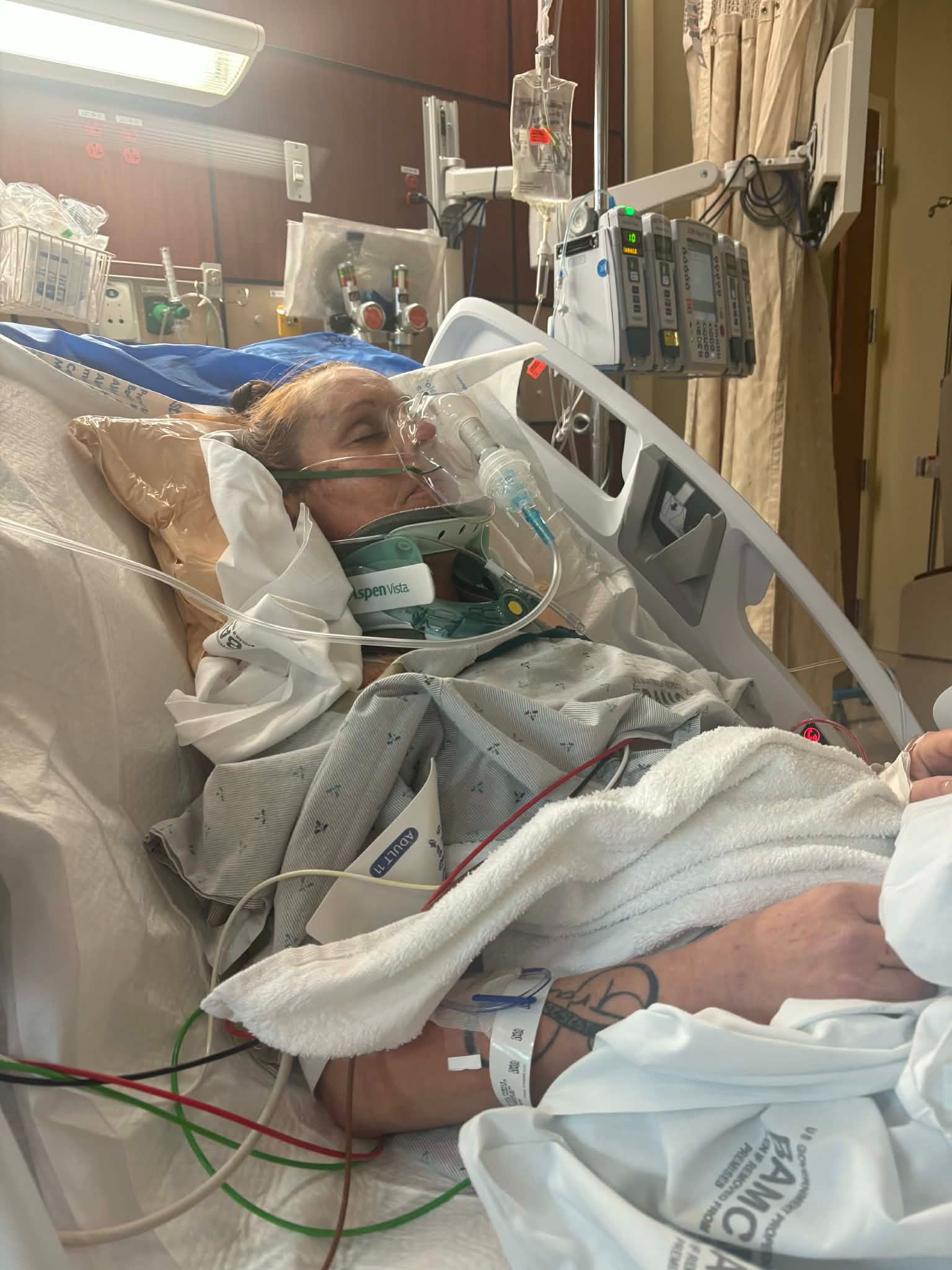 Pamela is my niece, Danielle’s mother. She was recently in a devastating car accident where her airbags failed to deploy. The impact left her with extensive injuries: a fracture at the base of her skull, a cervical spine fracture, multiple fractures throughout her thoracic and lumbar spine, a broken shoulder, a broken clavicle, and broken ribs. She was life-flighted to a military trauma center for emergency treatment, where she required a chest tube for internal bleeding and underwent a major spinal fusion surgery to stabilize her back.