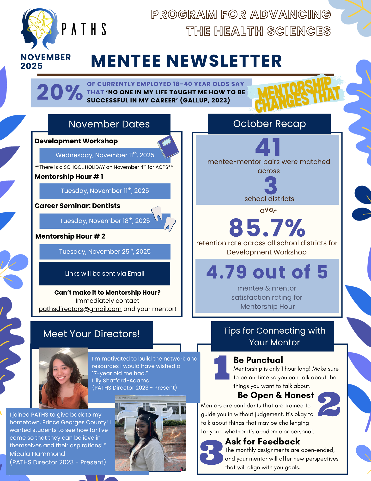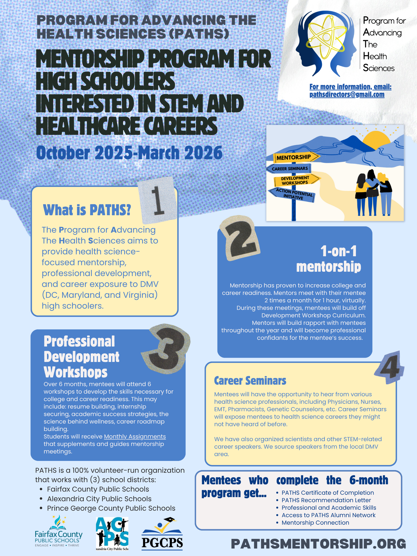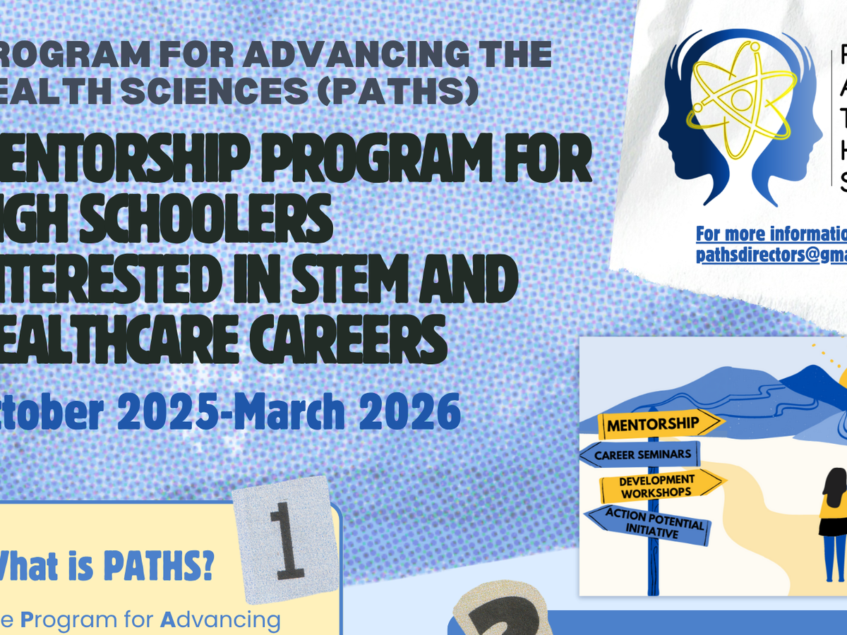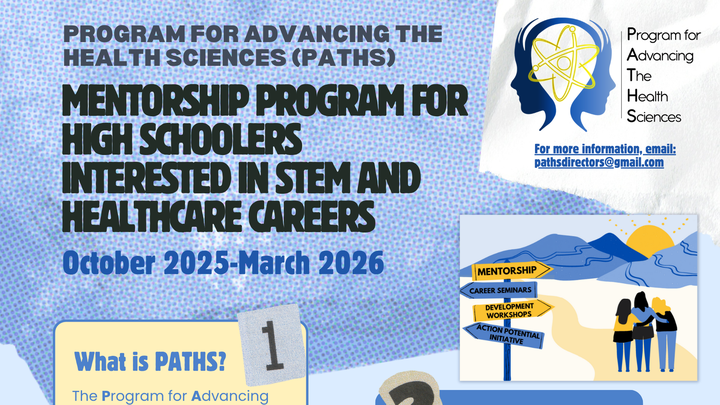 The Program for Advancing The Health Sciences (PATHS) is a Virtual, 100% volunteer-run mentorship program based out of Bethesda, Maryland that connects DMV (DC, Maryland, Virginia) High School students who are interested in biology and health with young working professionals in the area. These students may come from underrepresented backgrounds, be future first-generation college students, or have few connections and resources for pursing a healthcare profession. Mentorship is provided in a structured, 2x month virtual setting by background-checked individuals.