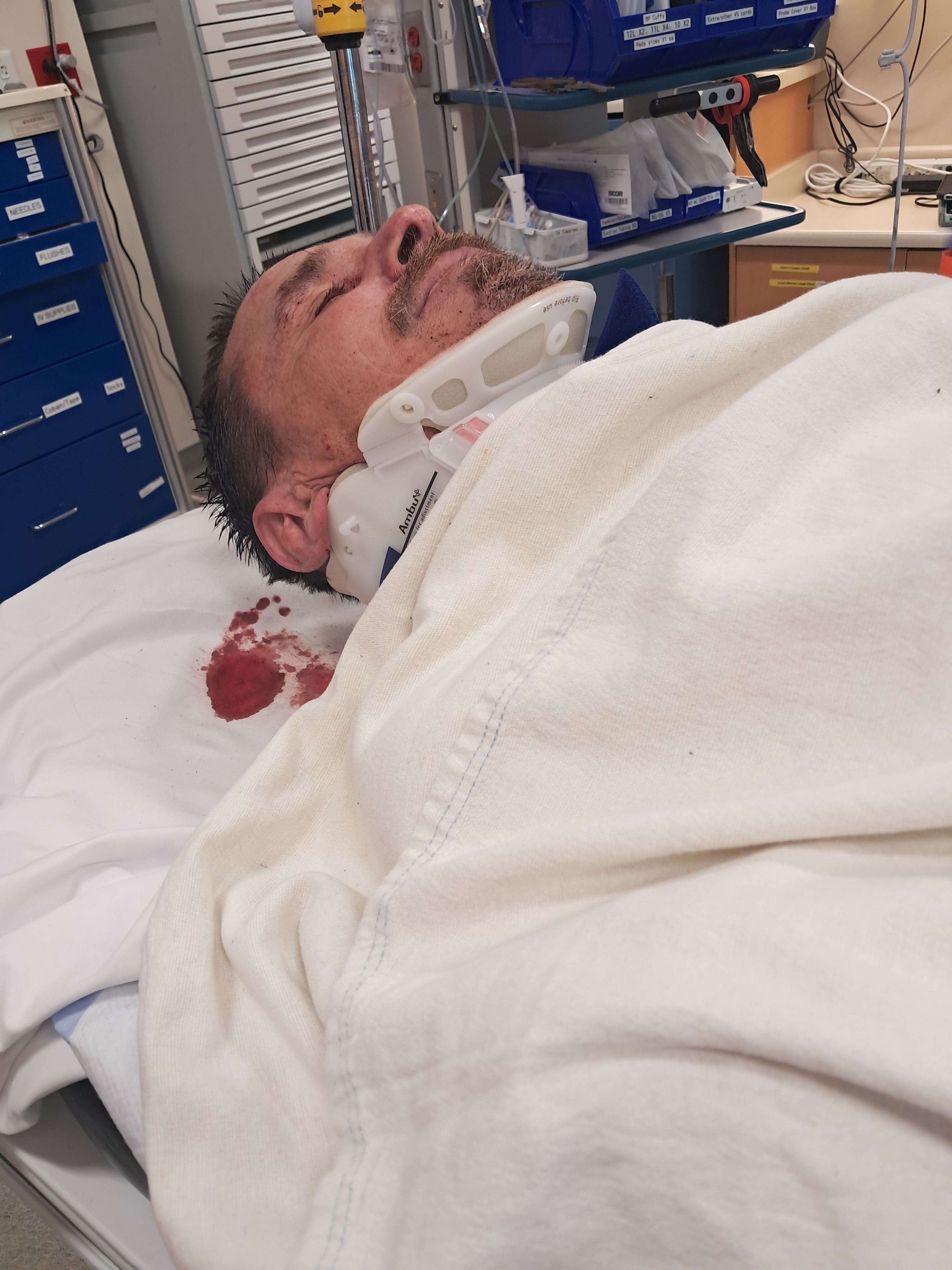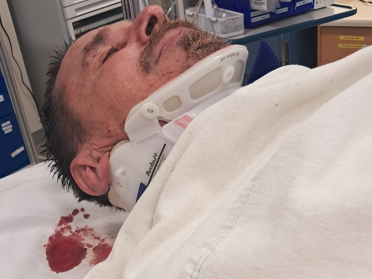 While hiking, Pat took a giant fall down the rocky side of the mountain. He fell approx. 160 ft., suffering a concussion. He lost a chunk of his scalp, requiring 13 staples in his head. He has 2 broken vertebrae in his back, he broke his pelvis in 2 places, requiring surgery to place a metal plate on one break, and pins and screws on the other pelvic break. He also has a small brain bleed.