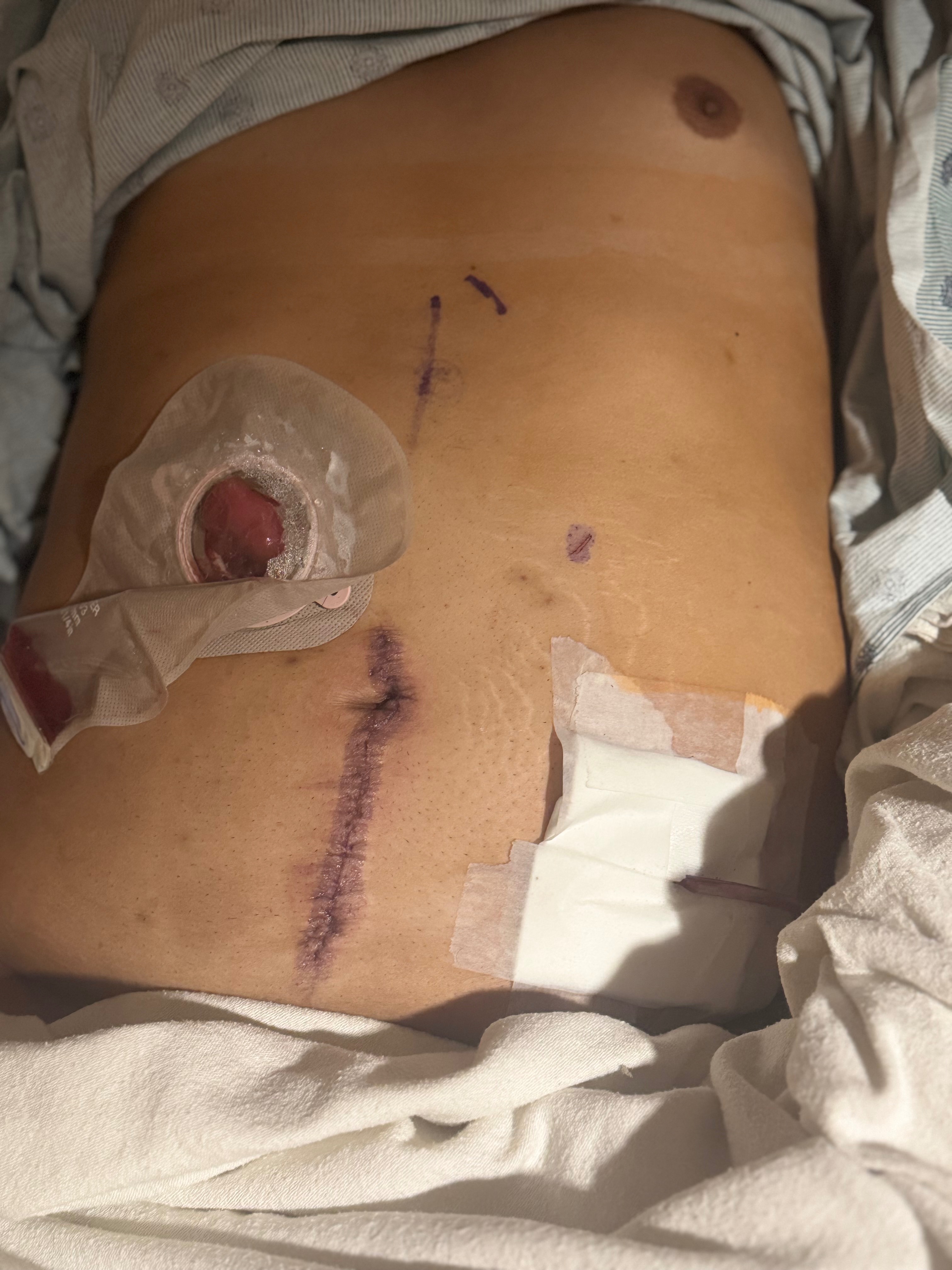 I needed to heal, so I was in a coma for a week. When I woke, I could barely walk and take steps because the nerves were all hit from the surgery and needed to be retrained. I then realized I have a catheter, a drainage bag in my kidneys, a drainage tube in my pelvis, a freshly installed ileostomy bag to function as my organs and two 12-inch incisions like an upside-down “T” on my stomach. The most painful and scary experience by far in life!! And it still isn’t over. I have my reversal surgery to come soon.