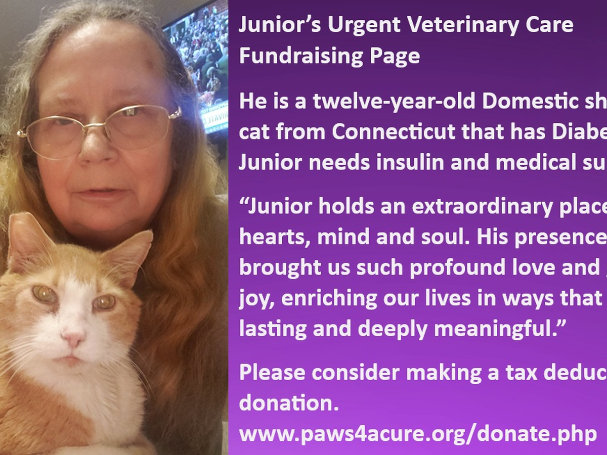 Meet Junior, a sweet twelve-year-old Domestic short hair cat from Connecticut who has Diabetes. His medical supplies and insulin are estimated to cost $339.27. Paws 4 A Cure is providing a $200 grant, but his mom and dad are trying to raise $1,000 to provide for multiple vet visits, medical supplies and insulin.