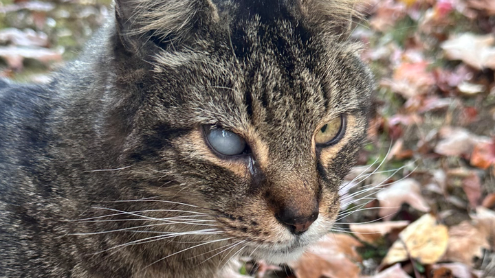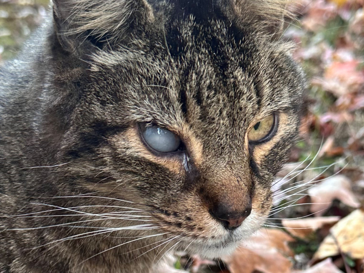 Penny, she is a 14 year old stray tabby who needs an emergency eye surgery for a Luxated lens to relieve pressure and pain and cataract surgery to restore her vision.