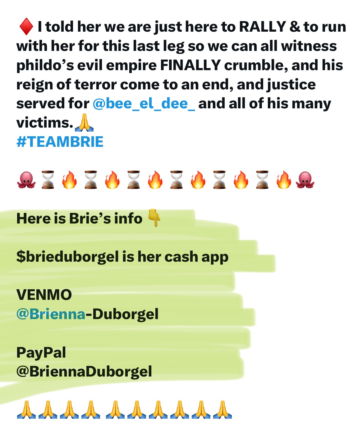 ♦️I told her we are just here to RALLY & to run with her for this last leg so we can all witness phildo’s evil empire FINALLY crumble, and his reign of terror come to an end, and justice served for @bee_el_dee_ and all of his many victims.