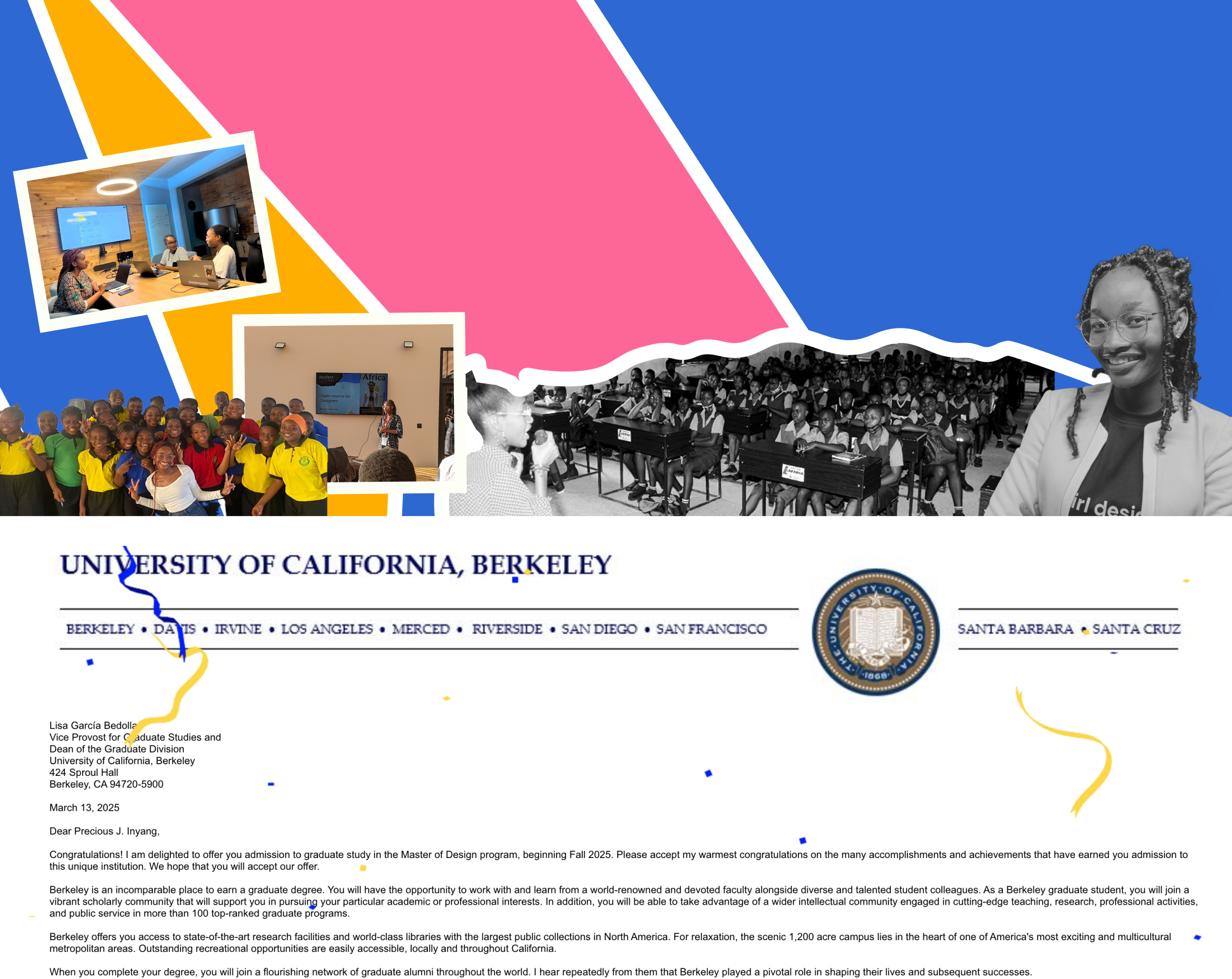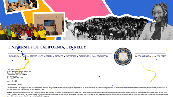 My name is Precious, and I am a first-generation college student from Calabar, a city in southern Nigeria. I am an early-career designer and community educator. Getting into the University of California, Berkeley is a huge step to expand the impact I've already started in communities across Sub-Saharan Africa and beyond.