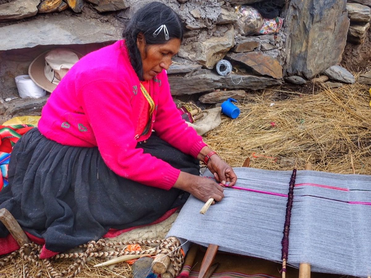 Weaving is integral to Q'ero life. Passed down through generations since Inka times, they make their clothing, ceremonial and other functional items. Their process starts with shearing their own alpaca and sheep, carding the wool through natural dyeing and weaving with traditional Inka symbols.
