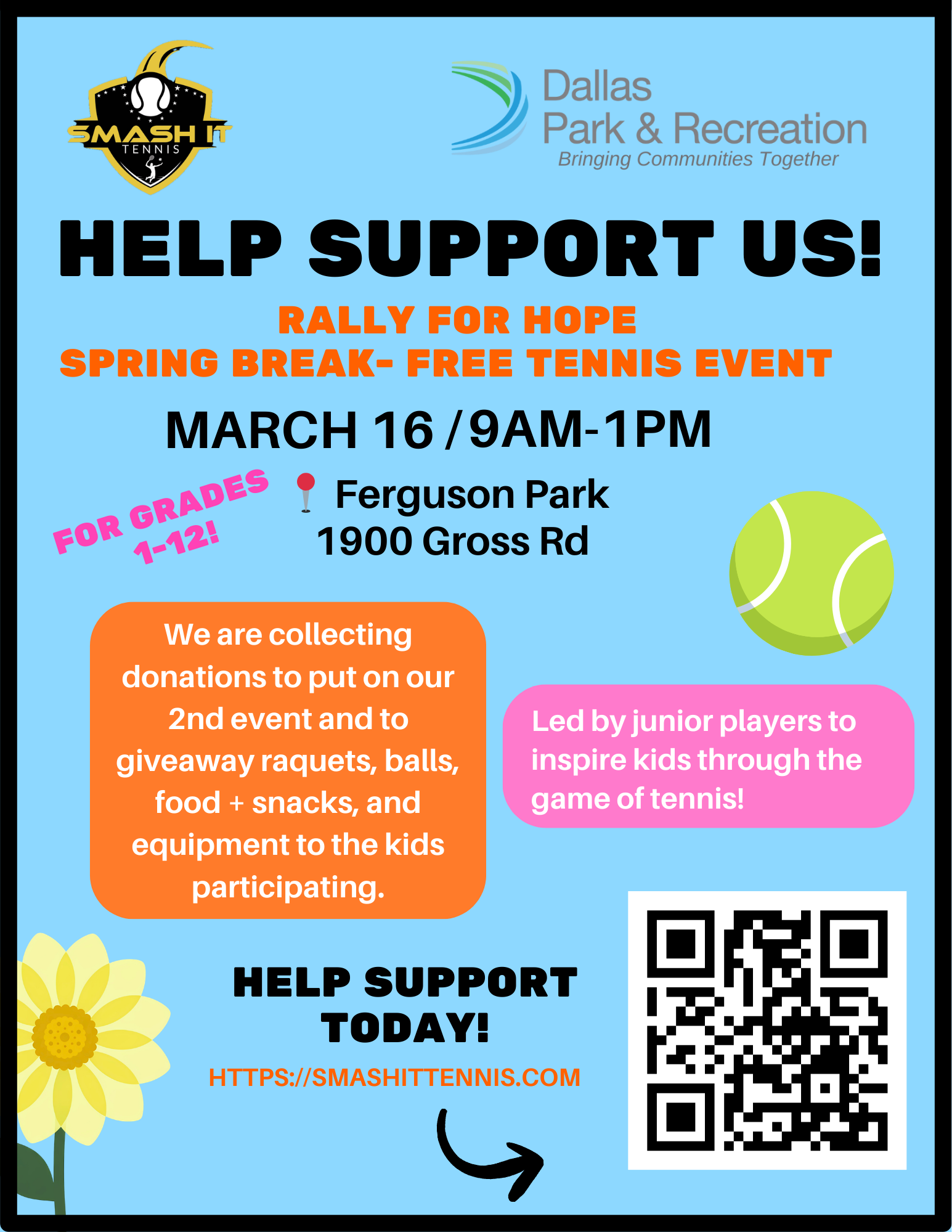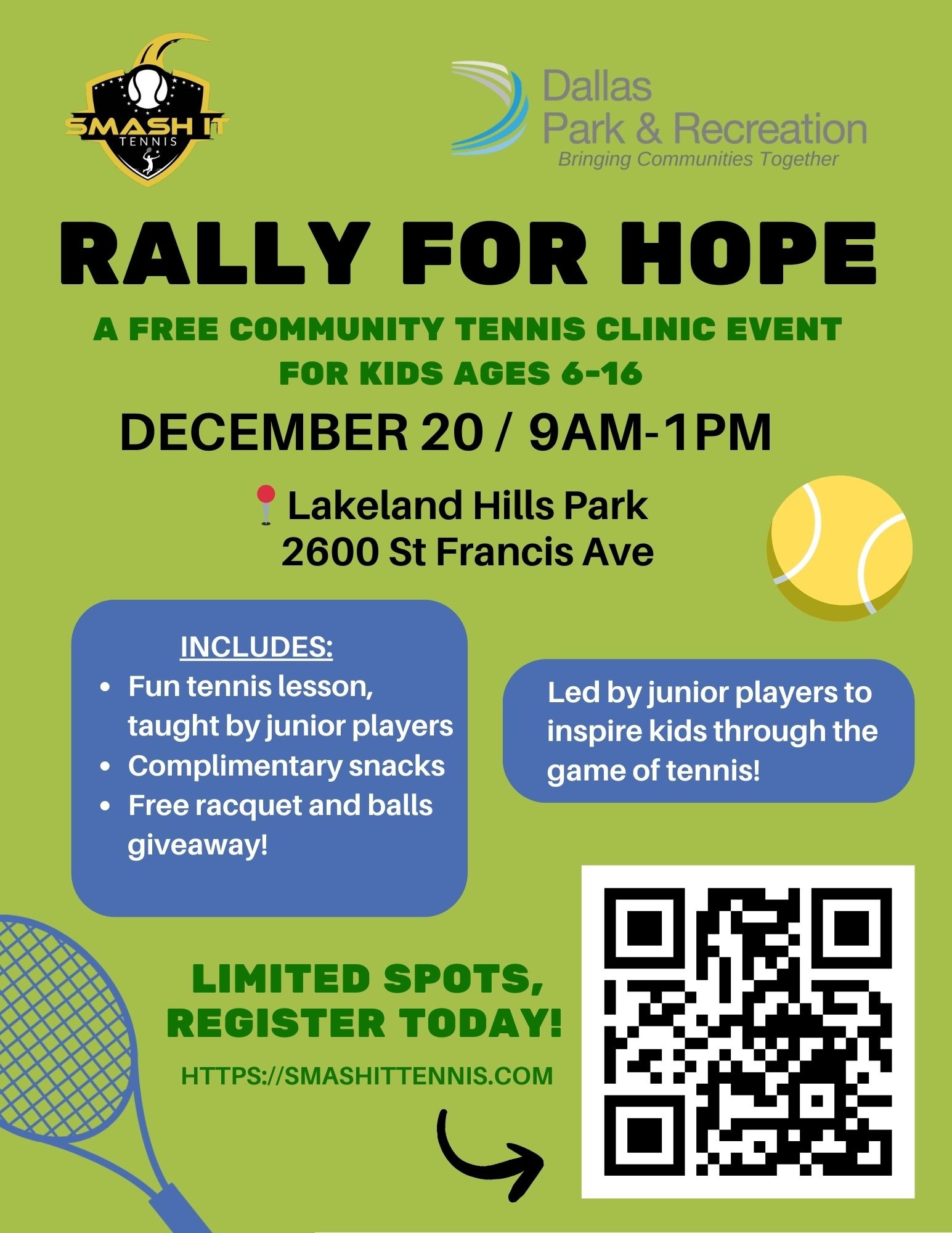 On December 20th, we proudly hosted our first-ever Rally For Hope community event in partnership with the City of Dallas Parks and Recreation Department. Thanks to the generosity, support, and kindness of our community, the event was an incredible success, and we were able to provide the kids with equipment, food, goodie bags, and more! Over 30 kids participated, learning tennis fundamentals, playing games, and leaving with smiles, new skills, and equipment they can continue to use. Seeing the impact firsthand reassured why this mission matters so much!