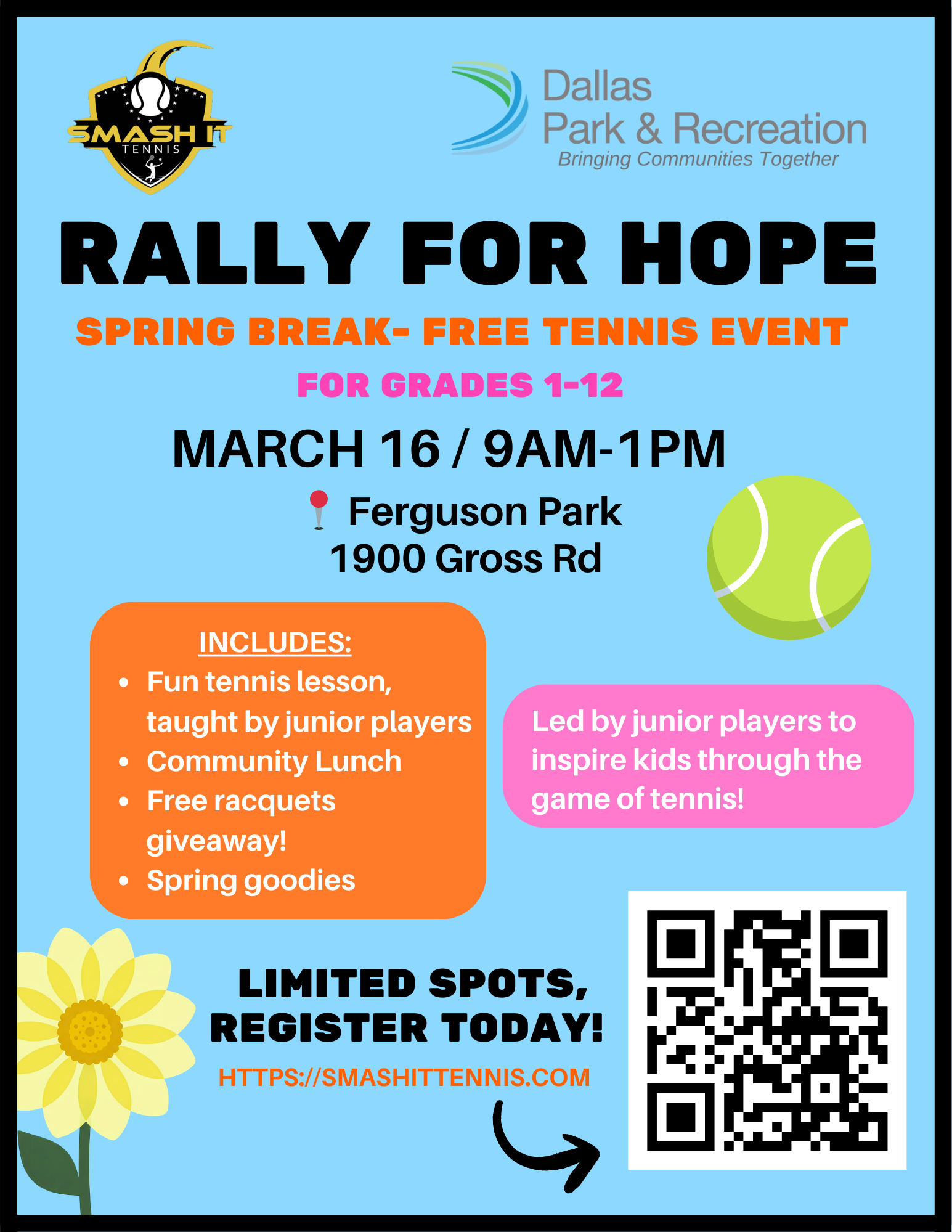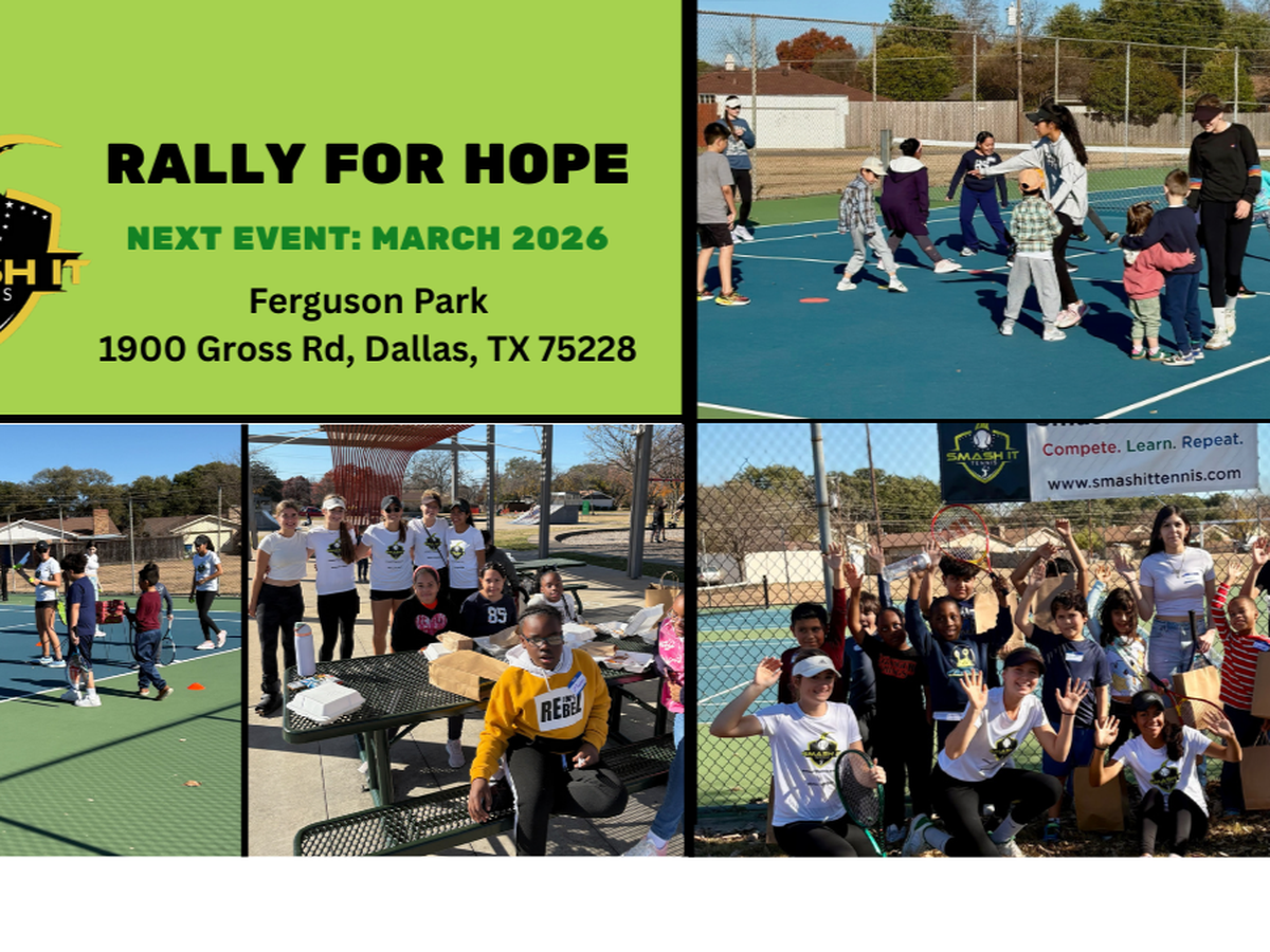 Rally For Hope is a youth-led nonprofit organization that hosts free community tennis clinics for kids ages 6–16 in underprivileged communities across Dallas. Our mission is to spread joy, confidence, and opportunity through the game of tennis by giving kids the chance to pick up a racket.
